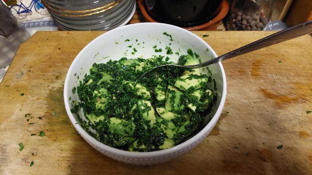 Se ia o mână de spanac crud, proaspăt, cu frunze mici, și se toacă mărunt. Se mai toacă și alte frunze… de pătrunjel, mărar, leuștean (dar să fie fraged, tânăr și nu ajuns la amăreala de la maturitate !), coriandru, busuioc, mentă, salvie (doar cele mici și fragede!) și se amestecă cu spanacul. Într-un bol… alb ar fi cel mai bine…