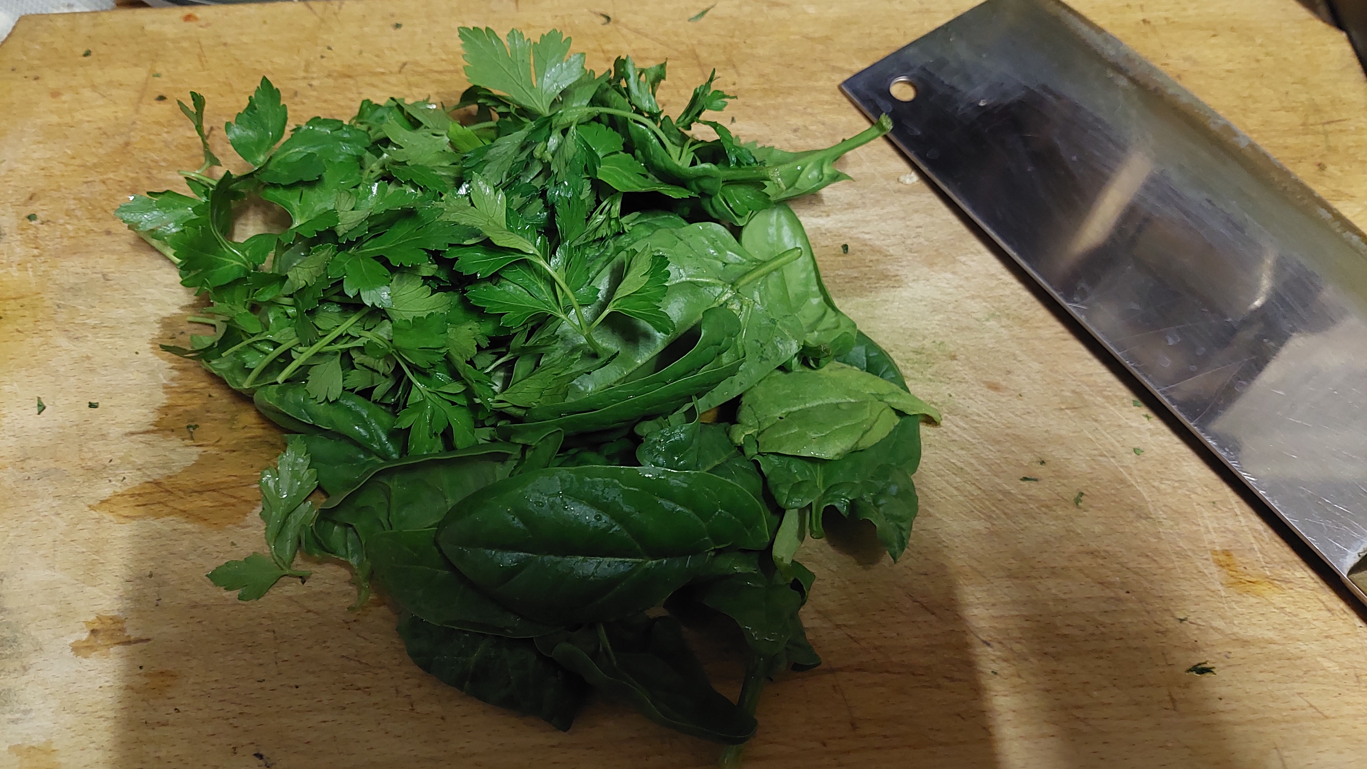 Se ia o mână de spanac crud, proaspăt, cu frunze mici, și se toacă mărunt. Se mai toacă și alte frunze… de pătrunjel, mărar, leuștean (dar să fie fraged, tânăr și nu ajuns la amăreala de la maturitate !), coriandru, busuioc, mentă, salvie (doar cele mici și fragede!) și se amestecă cu spanacul. Într-un bol… alb ar fi cel mai bine…