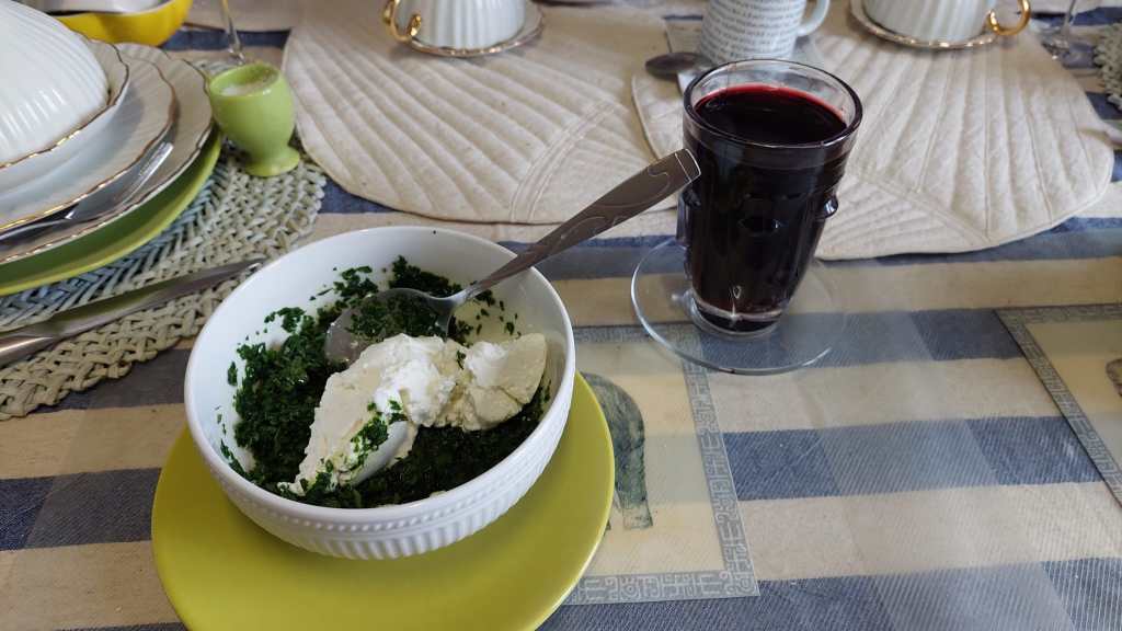Se ia o mână de spanac crud, proaspăt, cu frunze mici, și se toacă mărunt. Se mai toacă și alte frunze… de pătrunjel, mărar, leuștean (dar să fie fraged, tânăr și nu ajuns la amăreala de la maturitate !), coriandru, busuioc, mentă, salvie (doar cele mici și fragede!) și se amestecă cu spanacul. Într-un bol… alb ar fi cel mai bine…