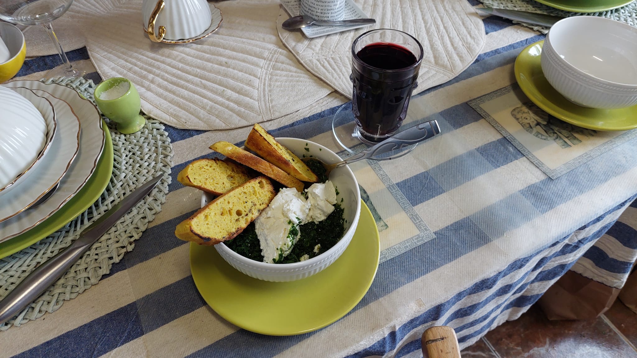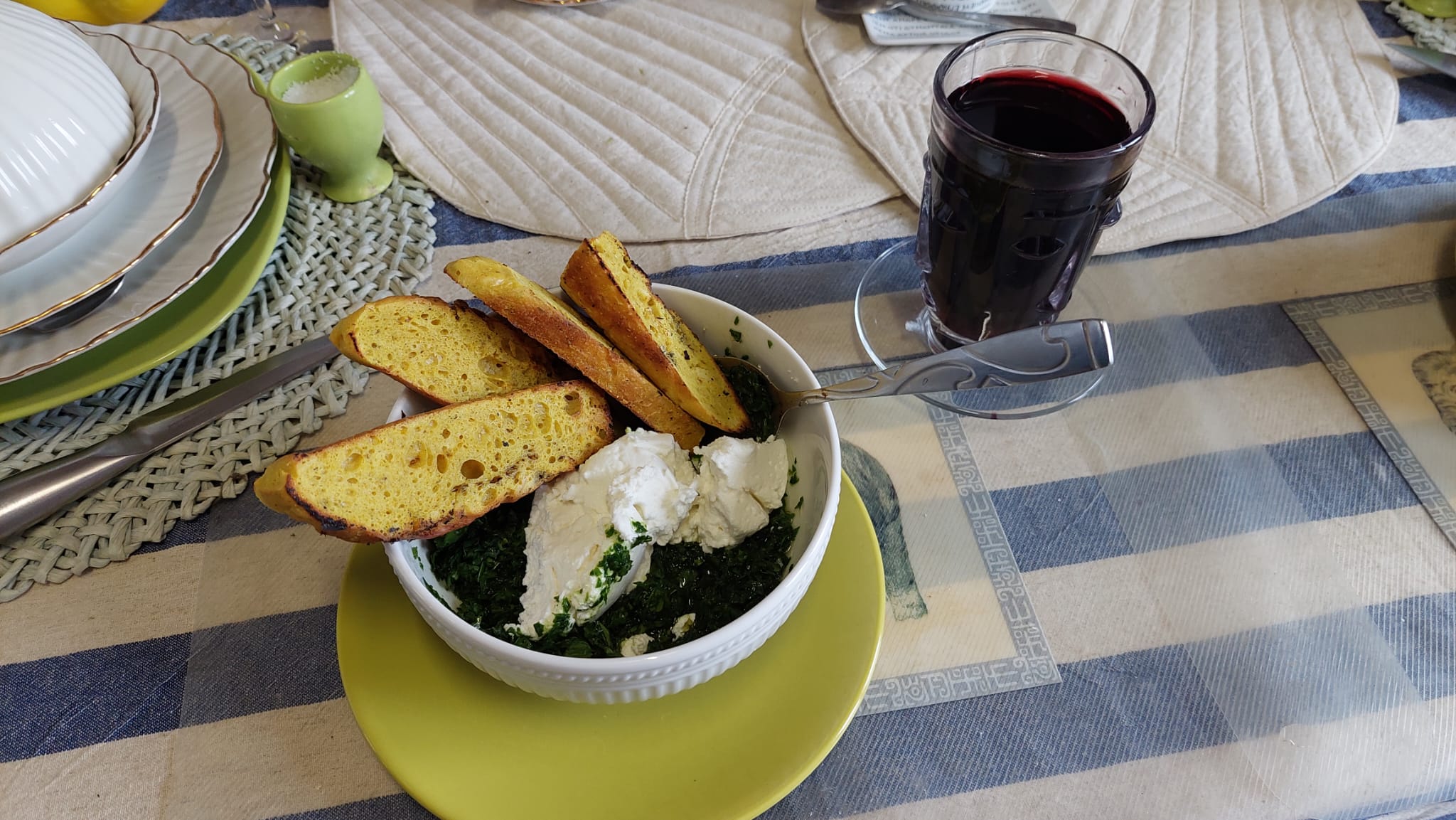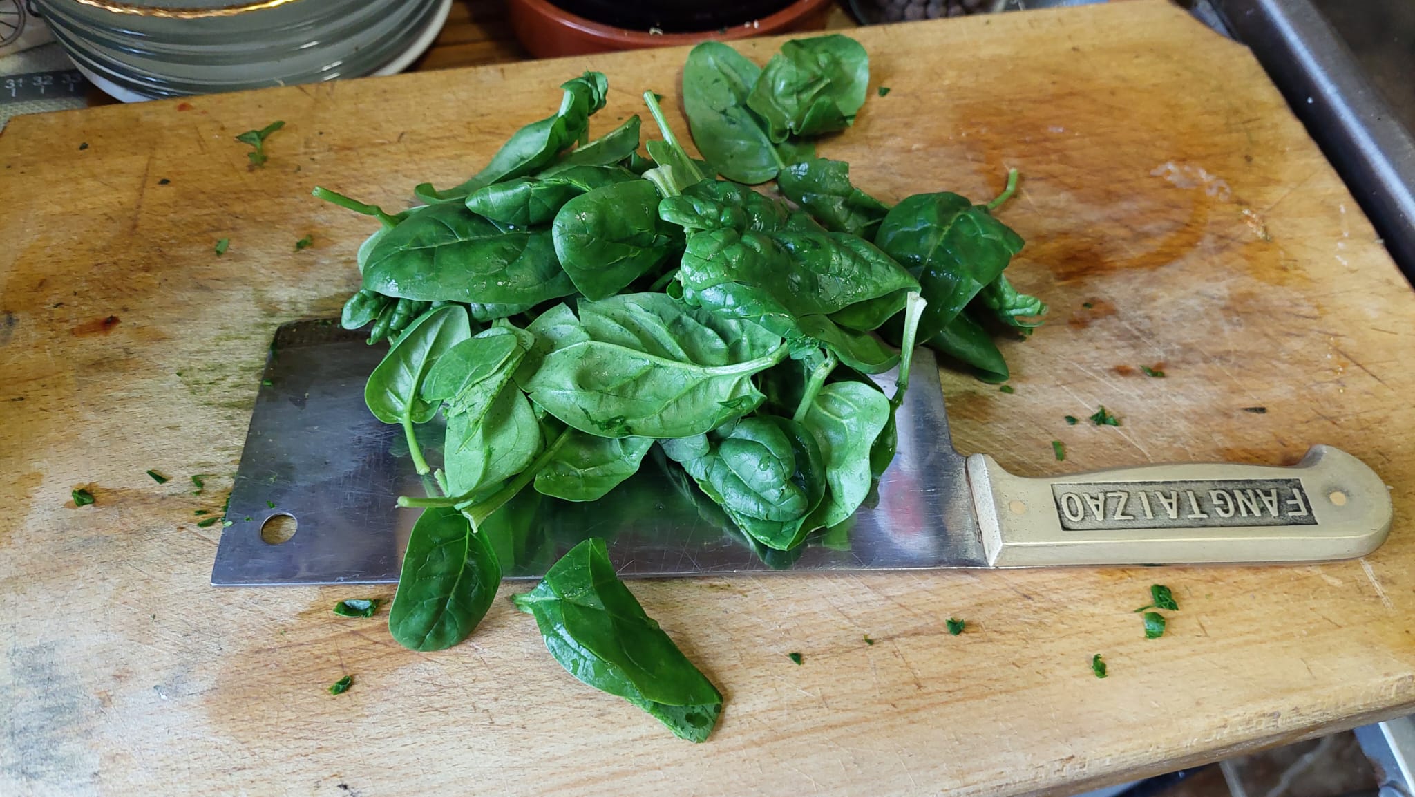 Se ia o mână de spanac crud, proaspăt, cu frunze mici, și se toacă mărunt. Se mai toacă și alte frunze… de pătrunjel, mărar, leuștean (dar să fie fraged, tânăr și nu ajuns la amăreala de la maturitate !), coriandru, busuioc, mentă, salvie (doar cele mici și fragede!) și se amestecă cu spanacul. Într-un bol… alb ar fi cel mai bine…