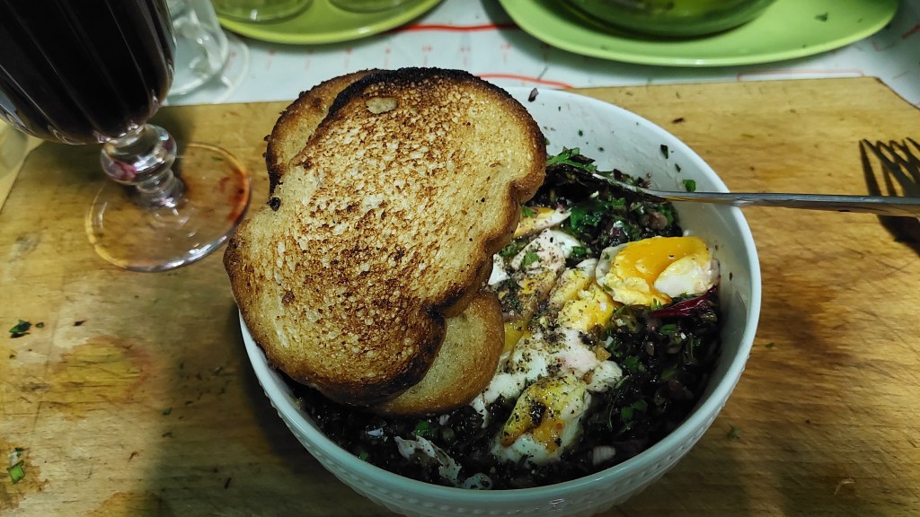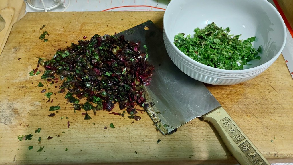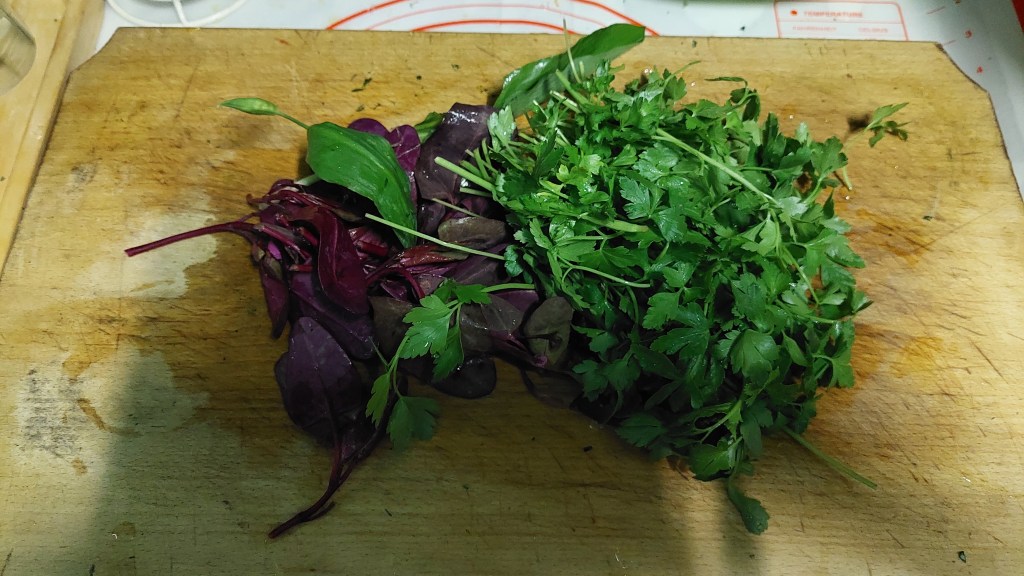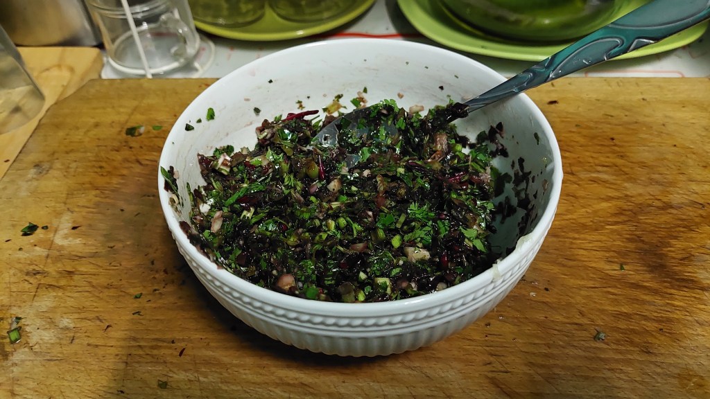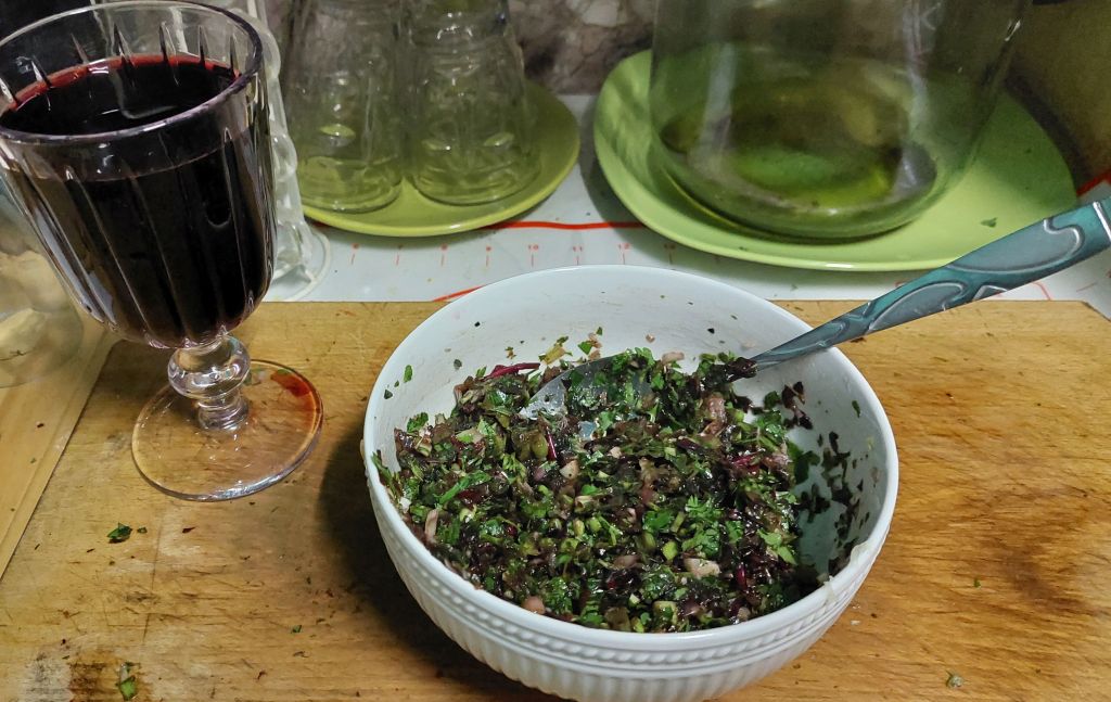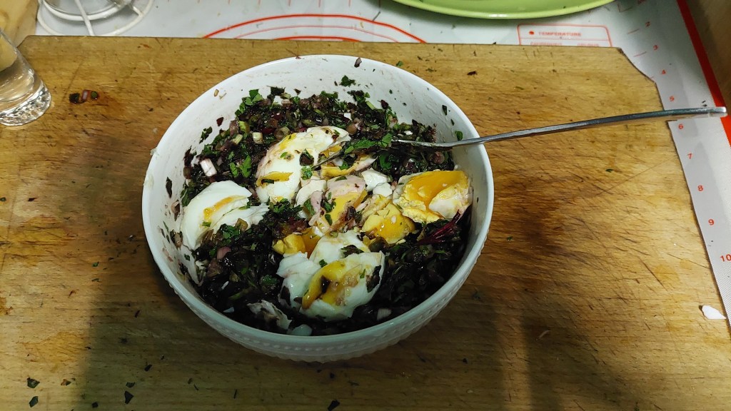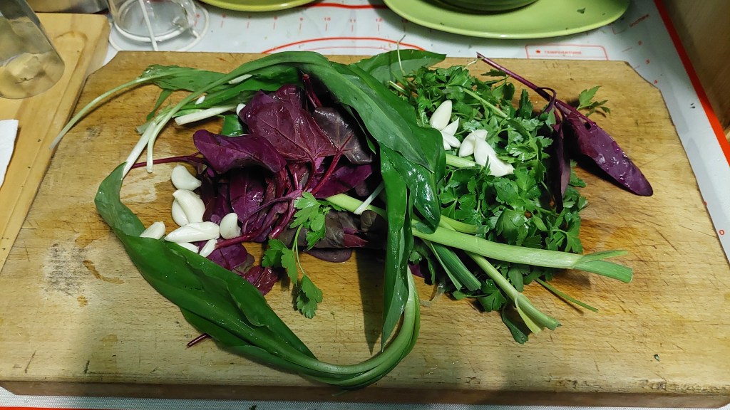 Lobodă roșie, leurdă, pătrunjel, usturoi verde (câte o legătură din fiecare!) și câțiva căței de usturoi nou, tânăr, crescut în căpățână. Se toacă mărunt și se amestecă cu ceva ulei de măsline… feciorelnic, parthenic, virgin cum scrie pe etichetă, cu un praf de sare, unul de piper și trei ouă fierte moi…