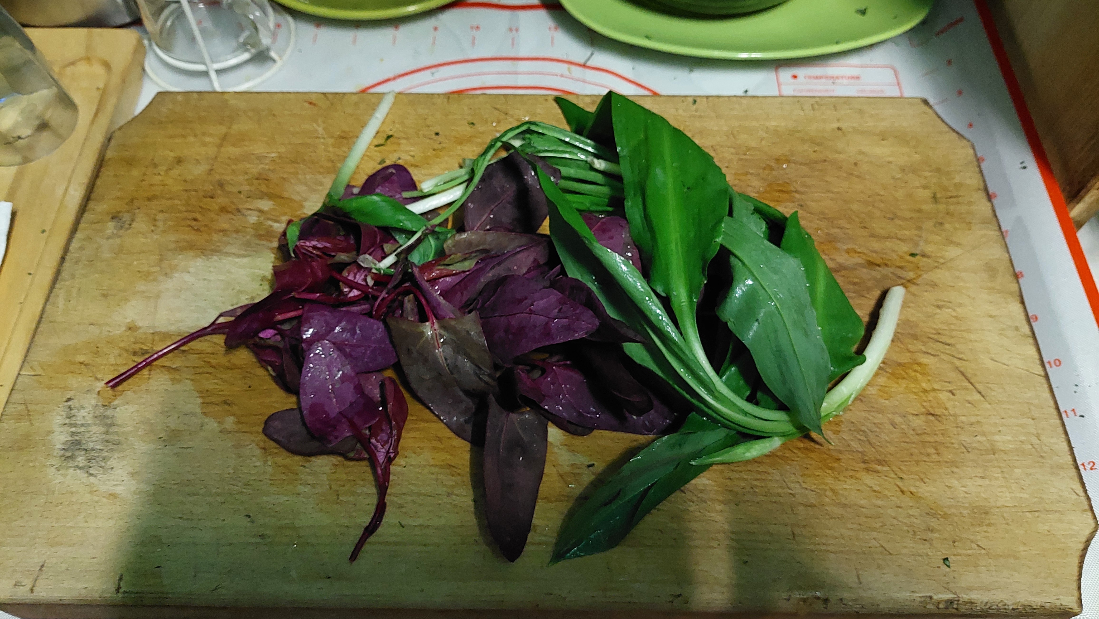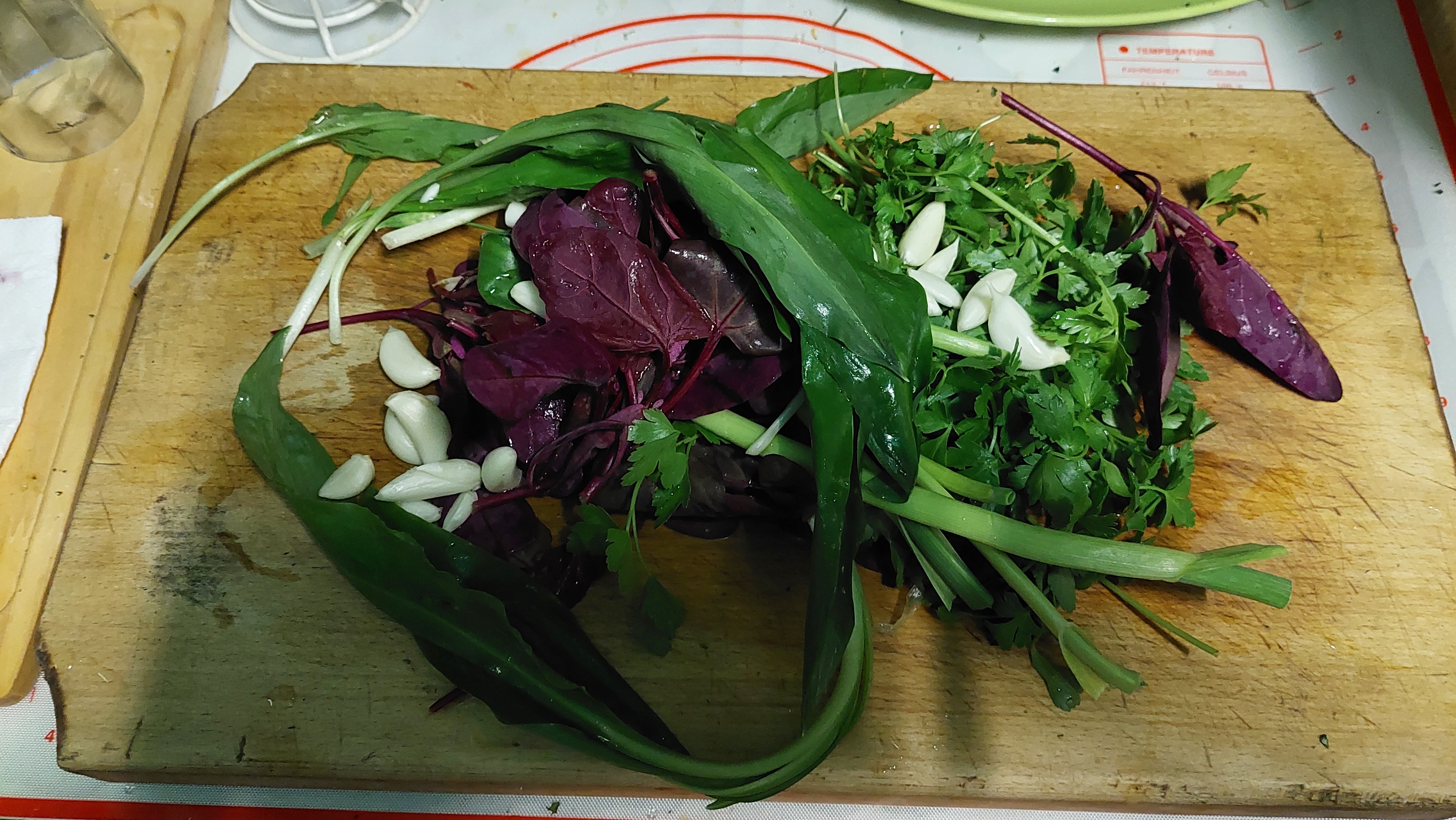 Lobodă roșie, leurdă, pătrunjel, usturoi verde (câte o legătură din fiecare!) și câțiva căței de usturoi nou, tânăr, crescut în căpățână. Se toacă mărunt și se amestecă cu ceva ulei de măsline… feciorelnic, parthenic, virgin cum scrie pe etichetă, cu un praf de sare, unul de piper și trei ouă fierte moi…