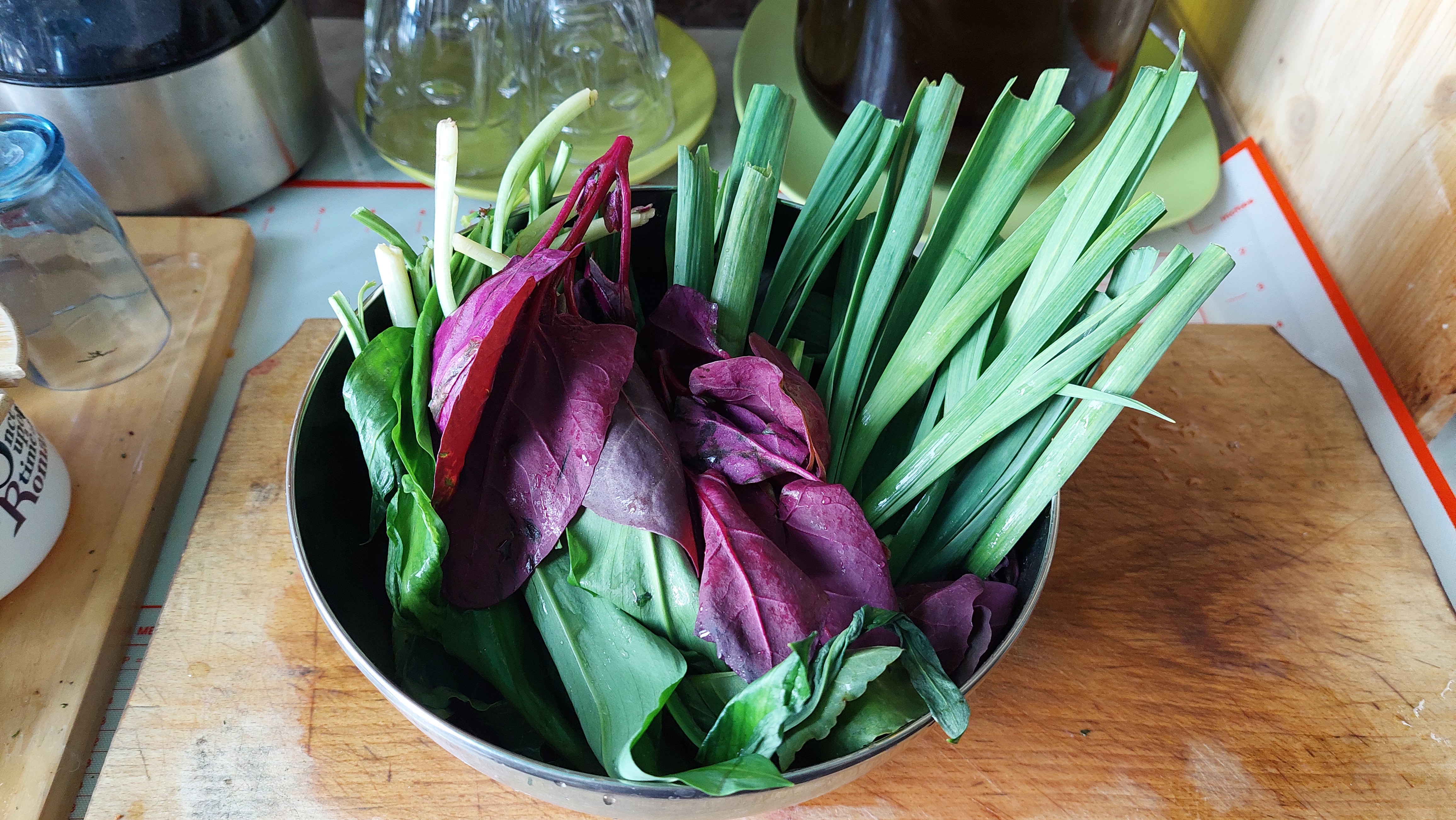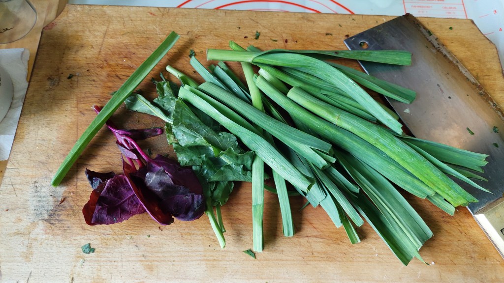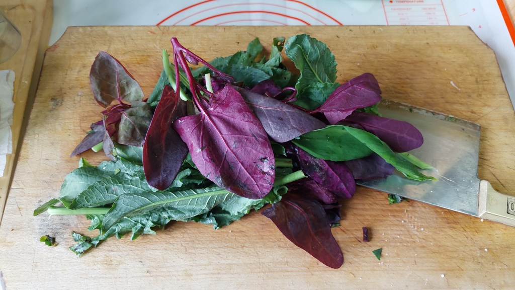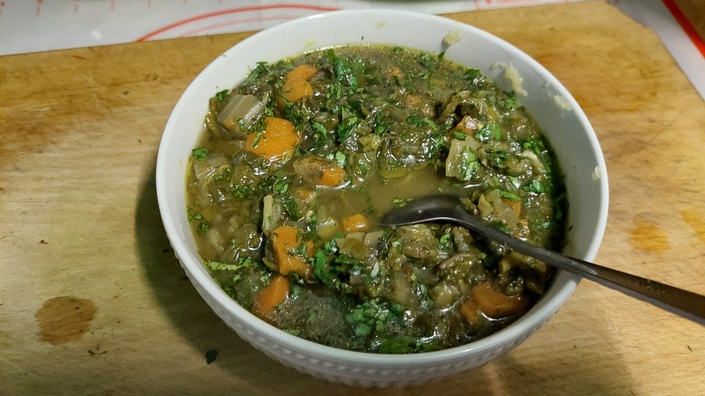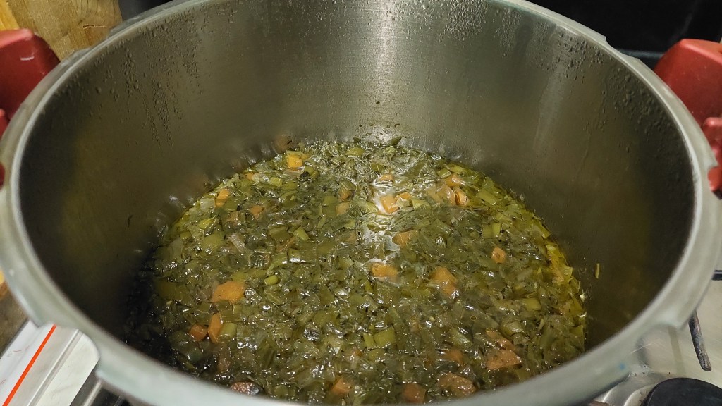 Lobodă, leurdă, ștevie – câte două legături -, lăptucă, măcriș, usturoi verde (doar frunzele) – câte două legături – : se taie mărunt și se pun în oala sub presiune (cuctă), în apă cât să le acopere, împreună cu șase morcovi potriviți, tăiați rondele sau rași, ceva ulei de măsline și sare. Se lasă pe foc cam 20 de minute după ce cucta ne spune că au început să fiarbă. Când presiunea a scăzut și putem deschide oala, turnăm fiertura într-un bol și peste ea punem un sos verde de coriandru proaspăt și înmiresmat (o legătură), amestecat cu puțină pulbere de cuișoare și de nucșoară și… doi căței de usturoi…