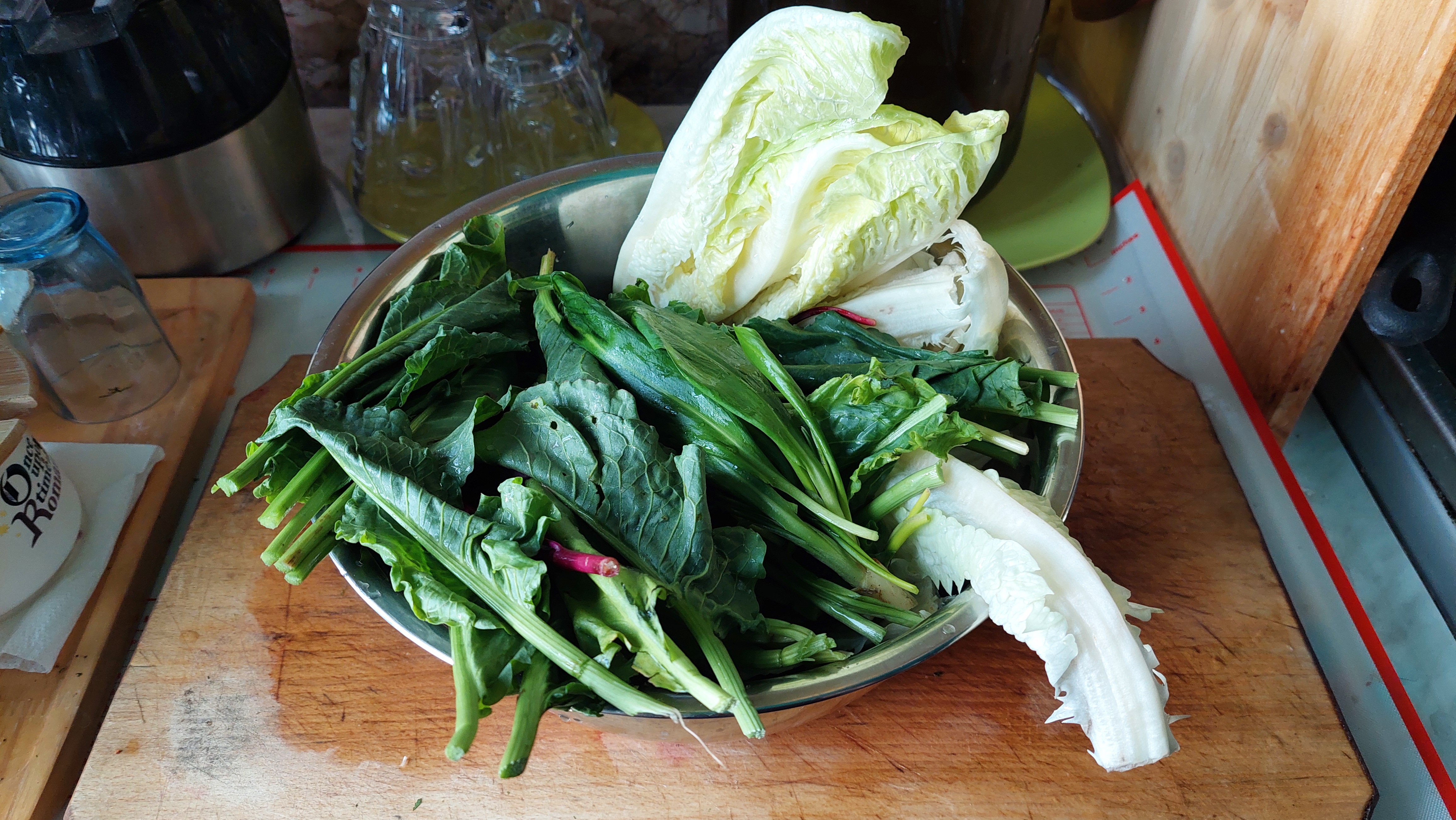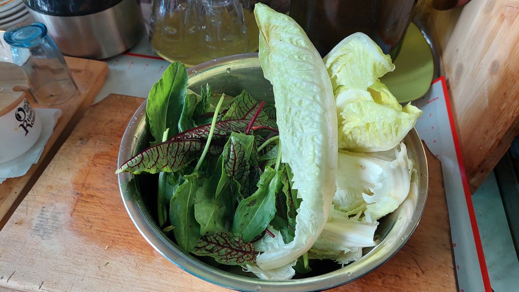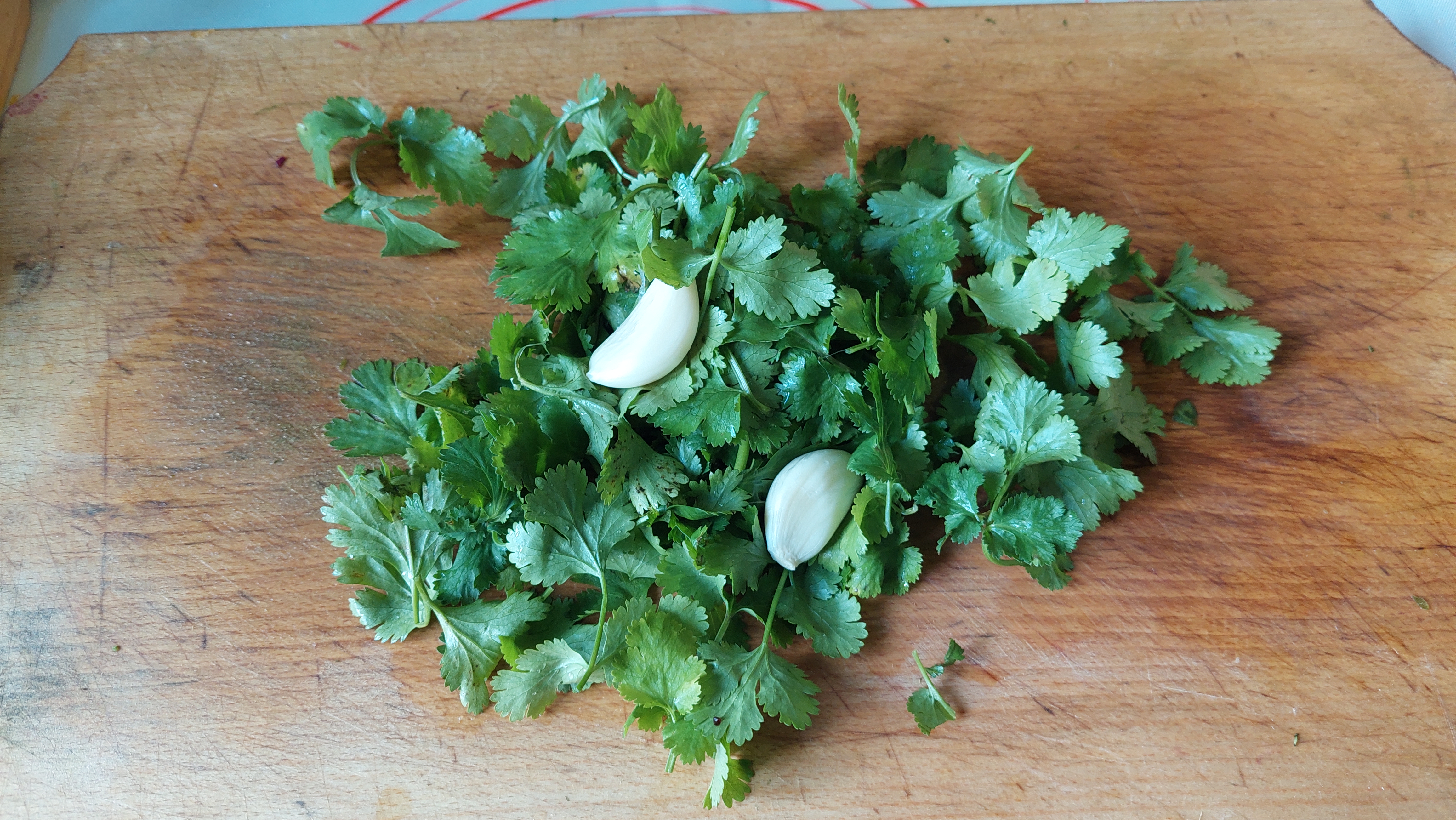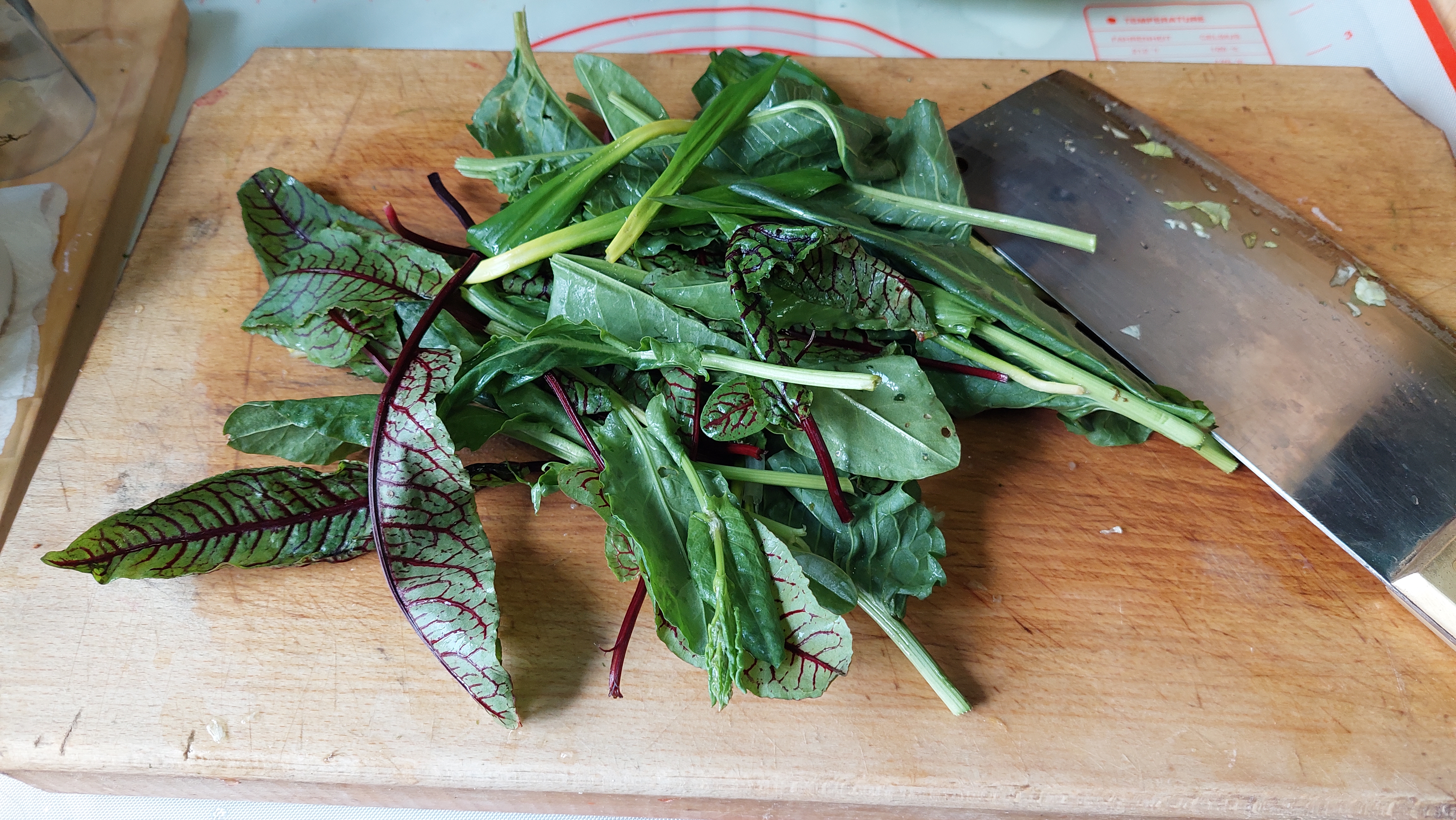 Lobodă, leurdă, ștevie – câte două legături -, lăptucă, măcriș, usturoi verde (doar frunzele) – câte două legături – : se taie mărunt și se pun în oala sub presiune (cuctă), în apă cât să le acopere, împreună cu șase morcovi potriviți, tăiați rondele sau rași, ceva ulei de măsline și sare. Se lasă pe foc cam 20 de minute după ce cucta ne spune că au început să fiarbă. Când presiunea a scăzut și putem deschide oala, turnăm fiertura într-un bol și peste ea punem un sos verde de coriandru proaspăt și înmiresmat (o legătură), amestecat cu puțină pulbere de cuișoare și de nucșoară și… doi căței de usturoi…