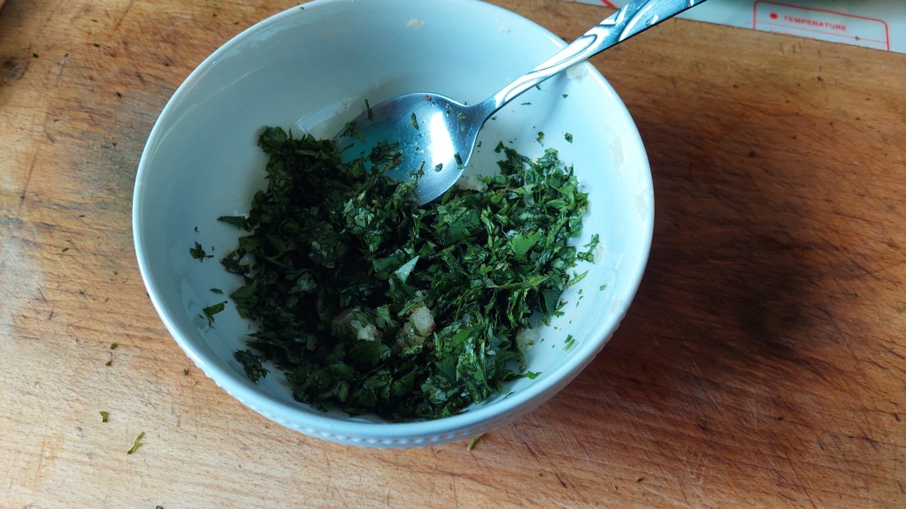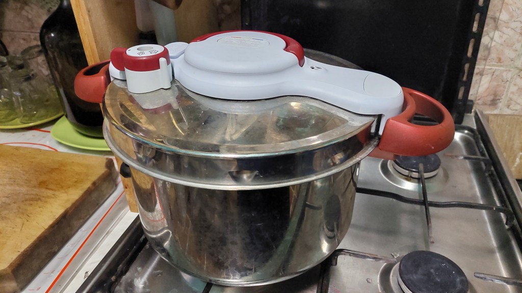 Όταν πέσει η πίεση και μπορούμε να ανοίξουμε το καπάκι και τη χύτρα, αδειάζουμε το φαγητό σε ένα μπολ και προσθέτουμε μια πράσινη σάλτσα από φρέσκο κόλιανδρο, πράσινος και ευωδιαστός (ένα ματσάκι), ανακατεμένο με λίγη σκόνη γαρύφαλλο και μοσχοκάρυδο και… δύο σκελίδες σκόρδο…