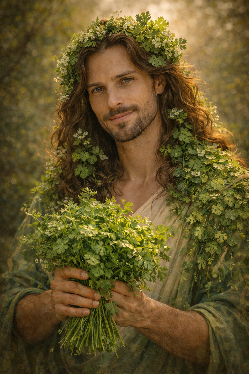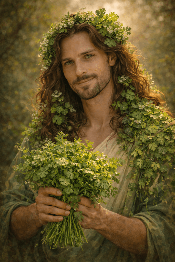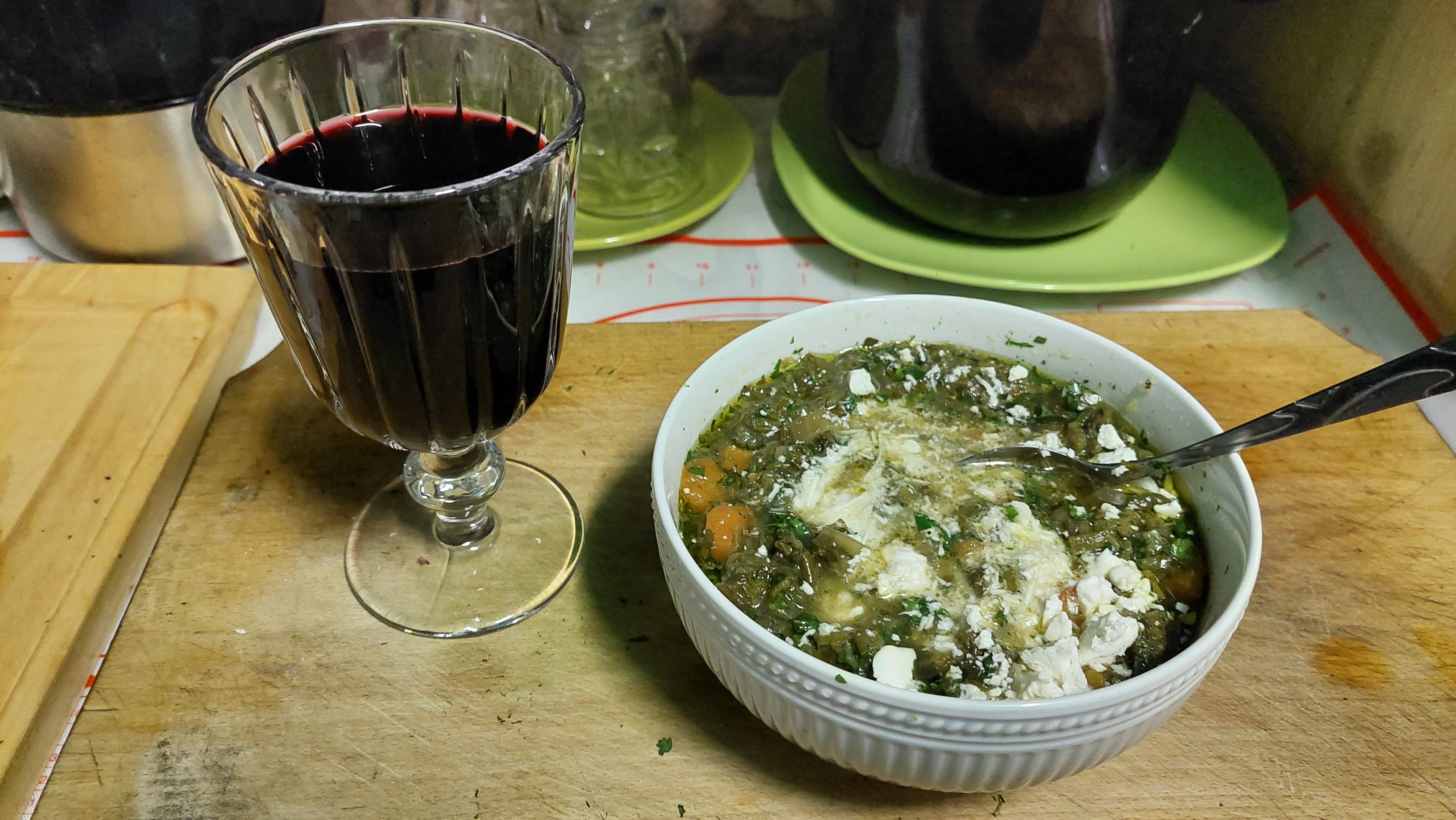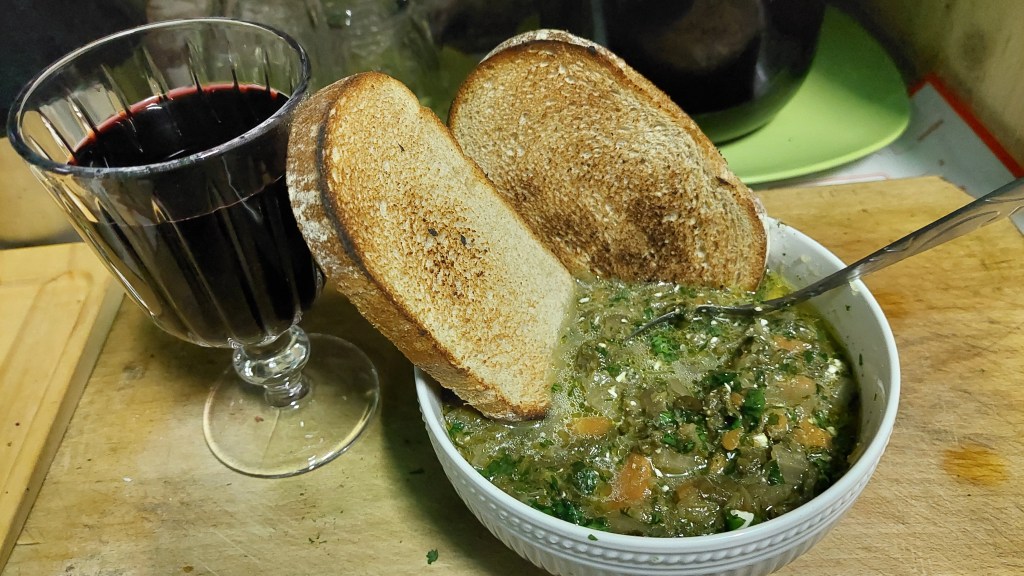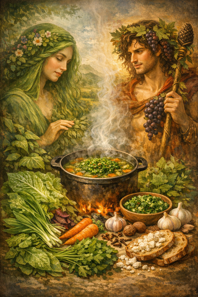 Μια συμπυκνωμένη χορτόσουπα, σχεδόν τελετουργική, όπου σμίγουν, ενώνονται οι χυμοί της Δήμητρας/Γης με εκείνους του Διονύσου. Το μαγείρευαν οι γιαγιάδες της φυλής για να δυναμώσει ο έρως, για να ευλογηθεί η ένωση, για να γίνει η αγάπη των νέων ζευγαριών — και όχι μόνο… καρπός.