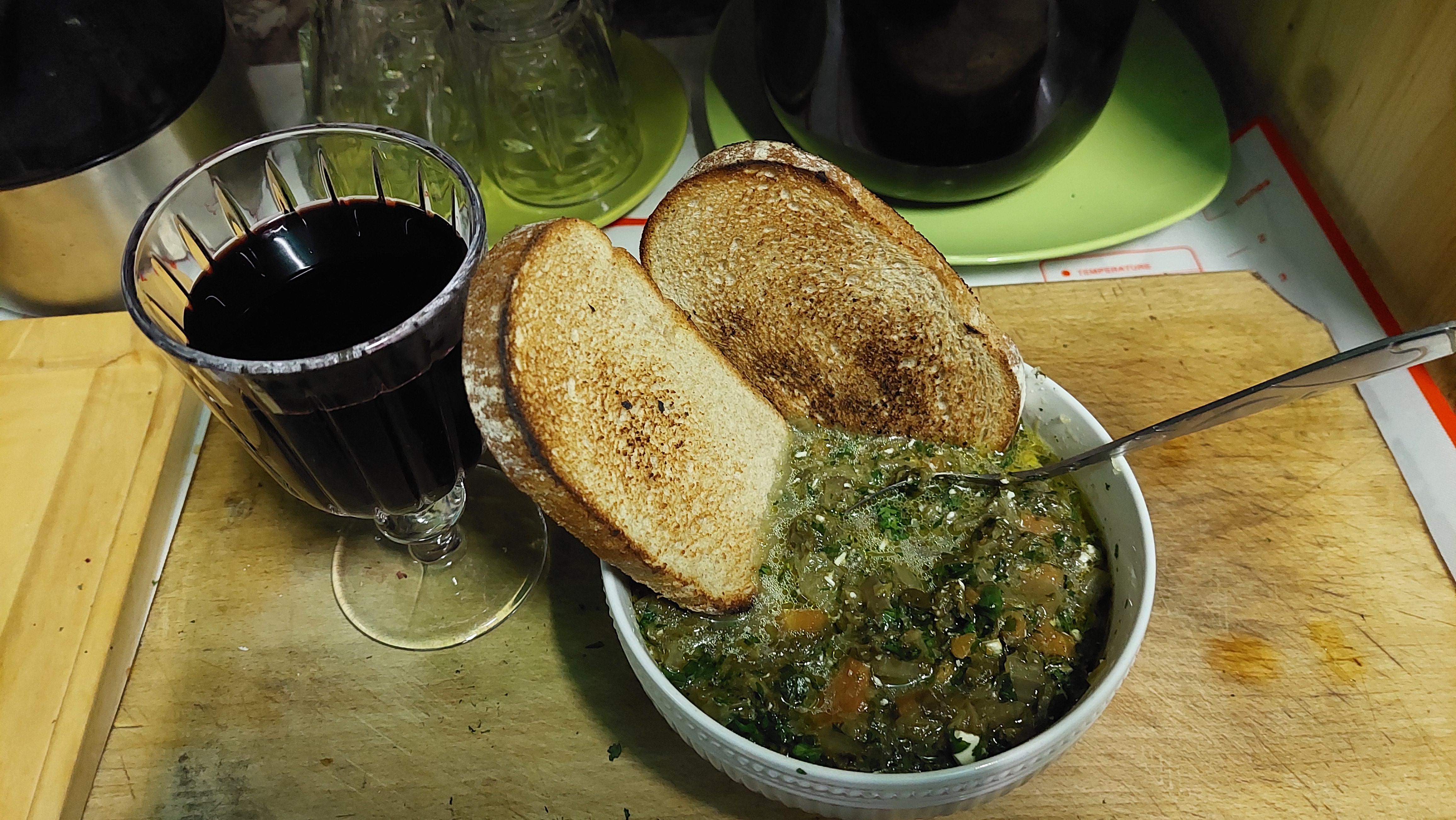 Μπορεί να συνοδευτεί με λίγο παλαιωμένο κατσικίσιο τυρί, τριμμένο, και δύο φέτες ψωμί φρυγανισμένες σε μαντεμένιο τηγάνι.