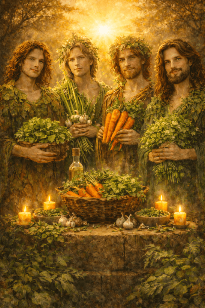 Τέσσερις αρσενικές ουσίες: το ξινόχορτο ή λάπαθο (măcrișul), το φρέσκο πράσινο σκόρδο (usturoiul verde), το καρότο (morcovul) και ο κόλιανδρος (coriandrul) – φορείς της φλόγας, φέρνοντας τον παλμό εκείνου που διασχίζει και γονιμοποιεί.