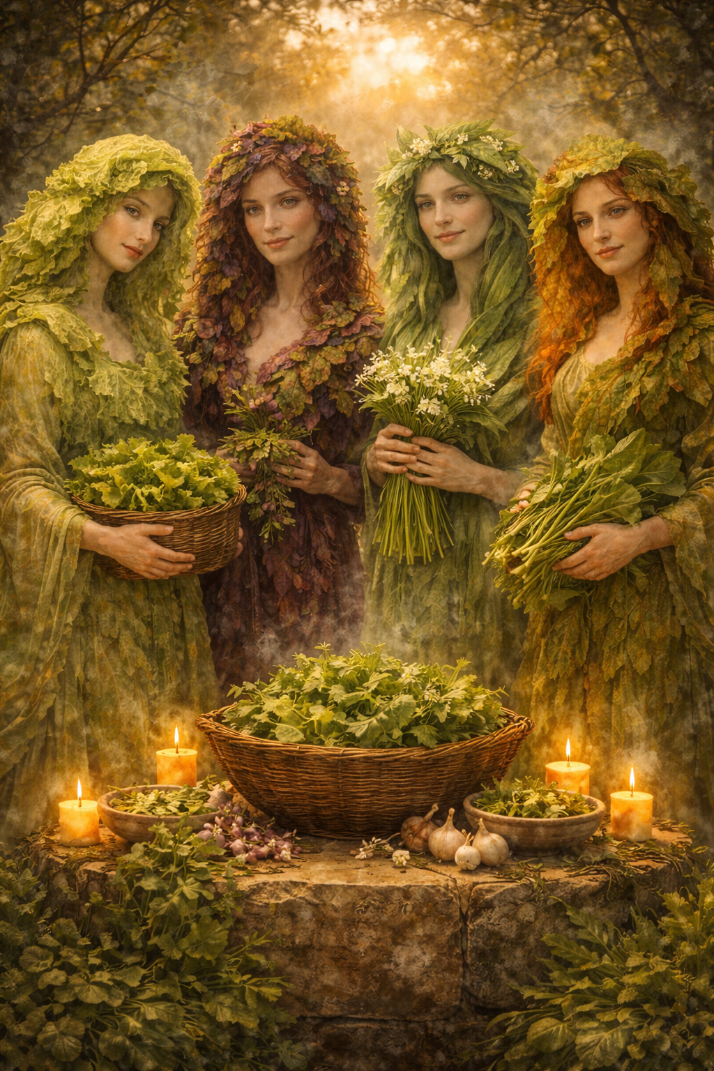 Τέσσερις θηλυκές ουσίες: το αγριοσπανάκι (loboda), το αγριοσκόρδο (leurda), το ήμερο λάπαθο (ștevia) και το μαρούλι (lăptuca).