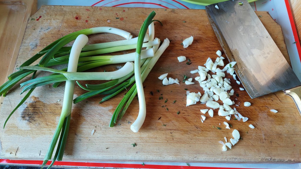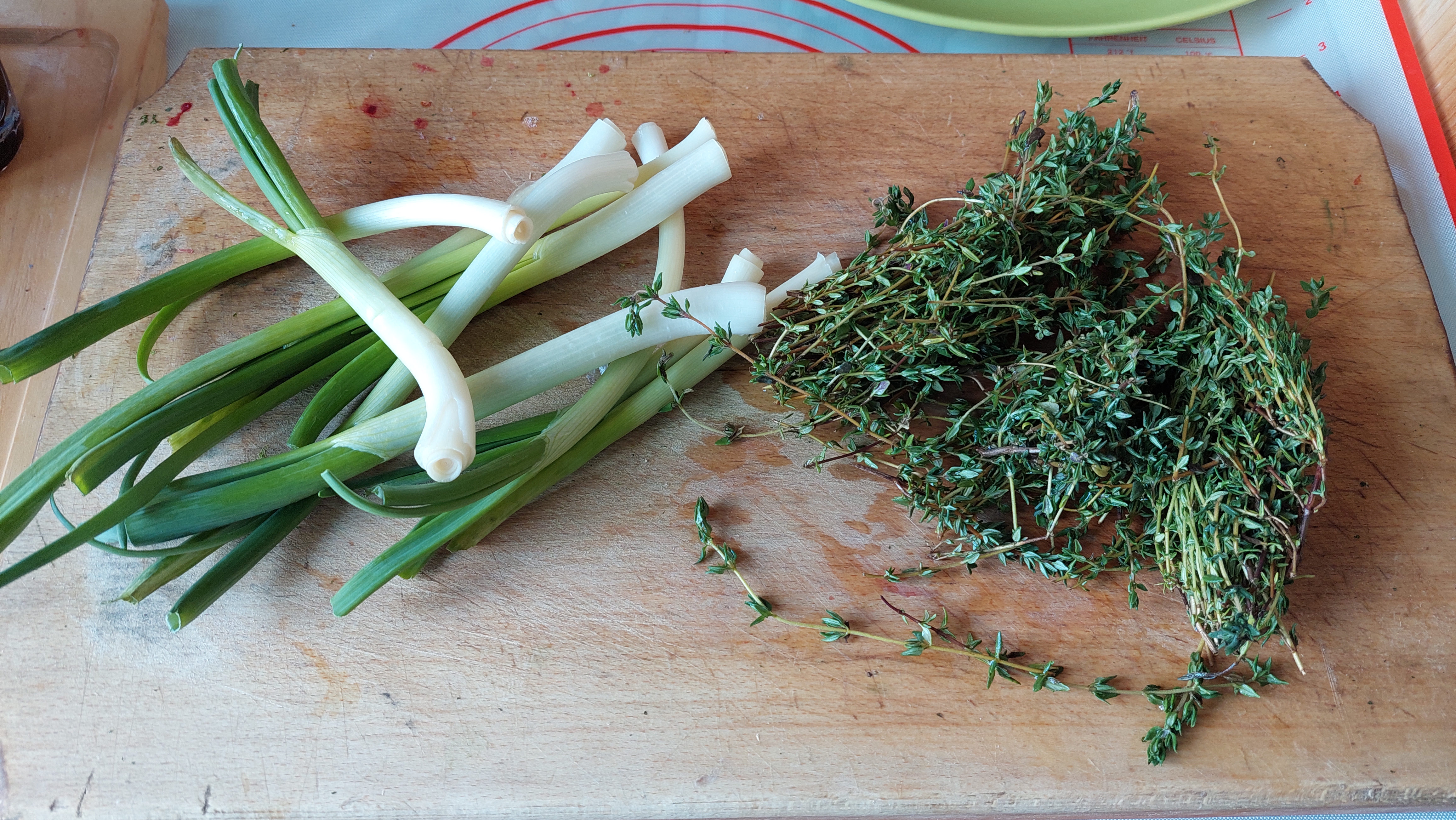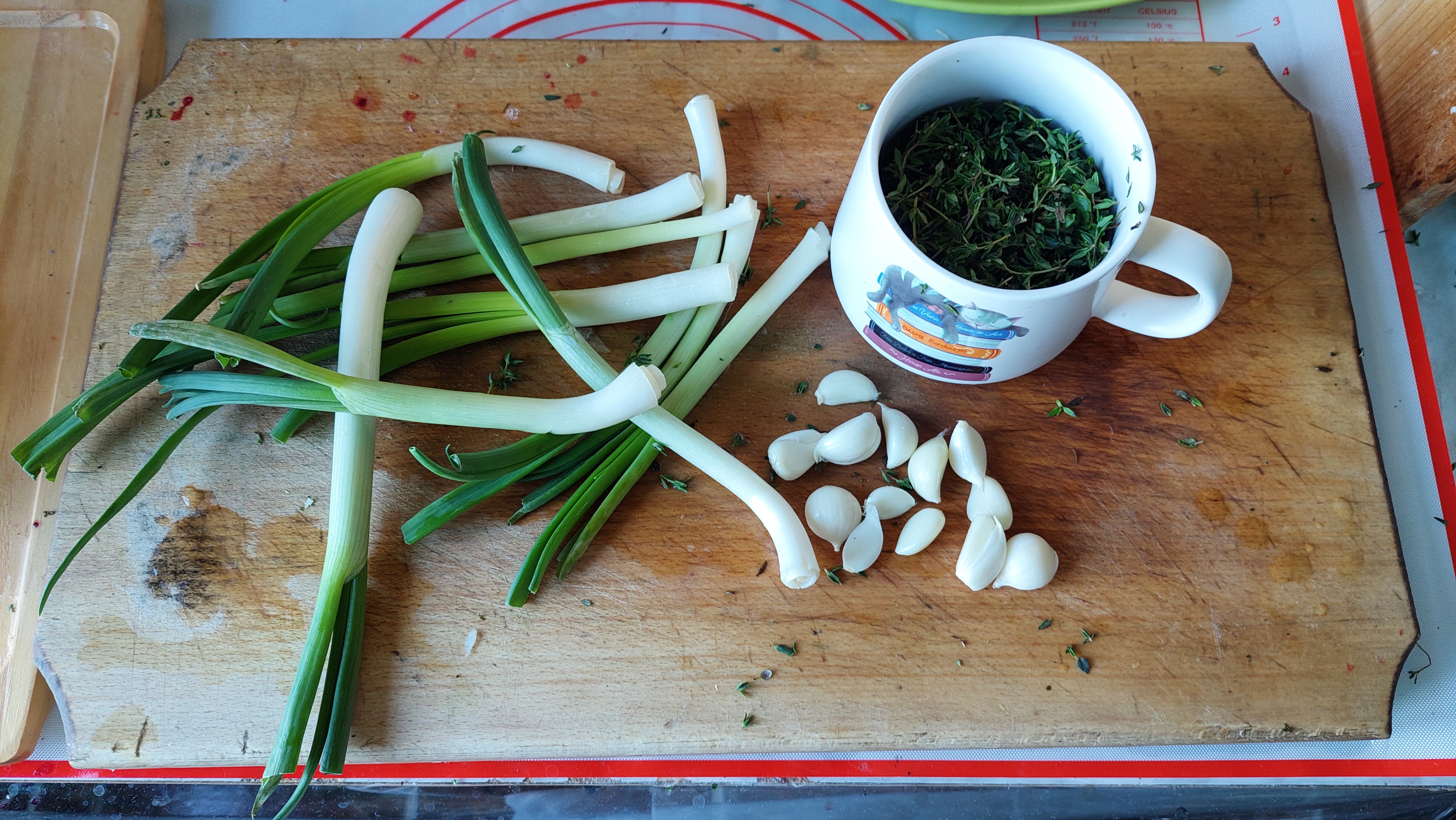 Se taie mărunt două legături de ceapă verde, tânără, proaspătă și se amestecă cu frunzulițele câtorva mici crenguțe de cimbru proaspăt, și ele tăiate mărunt.