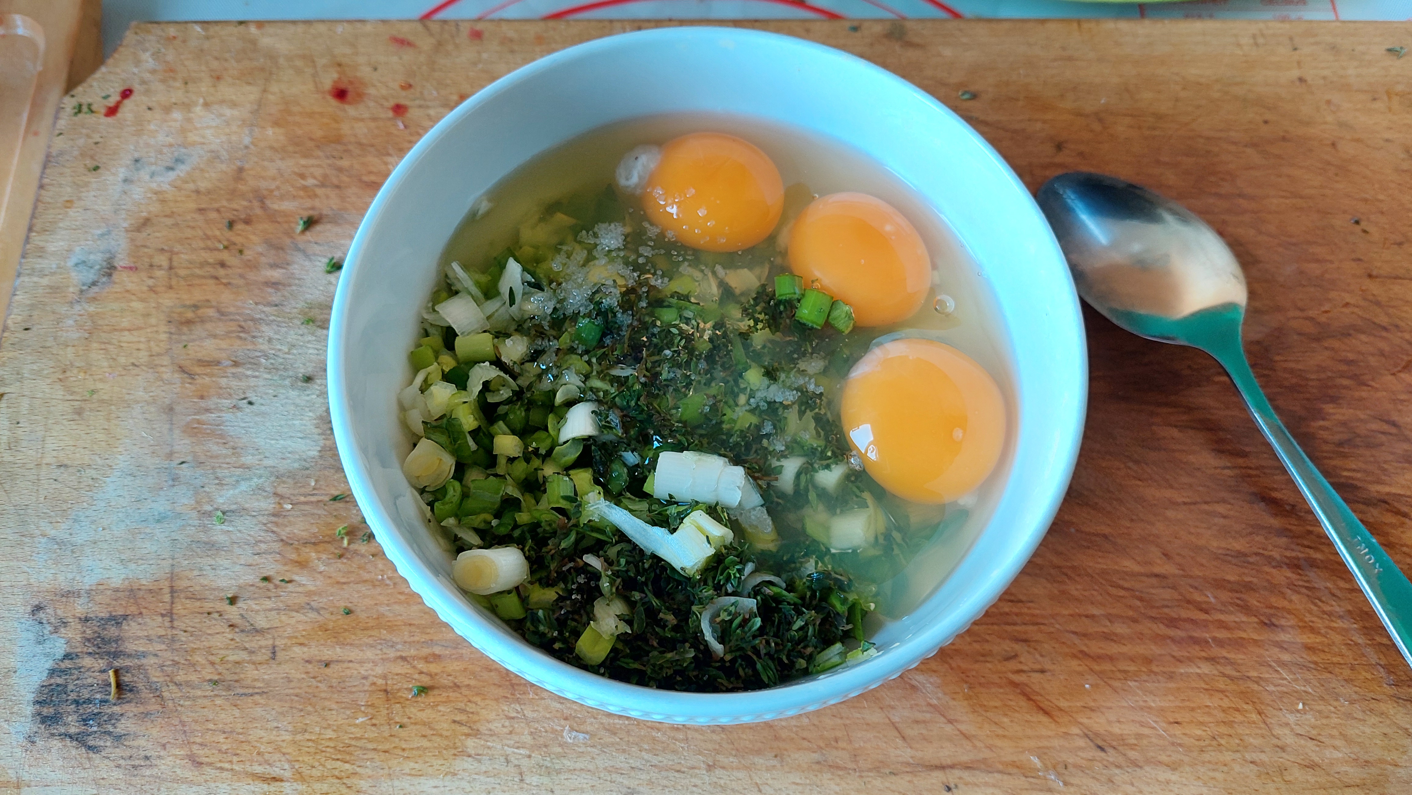 Și totul se amestecă cu trei ouă și cu câțiva căței de usturoi nou, de primăvară (o căpățână întreagă!).