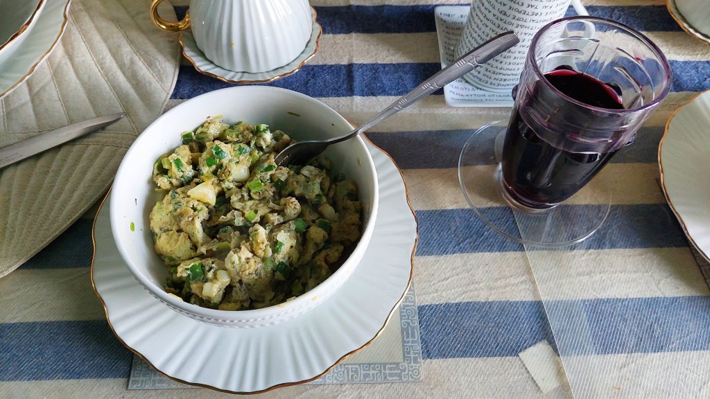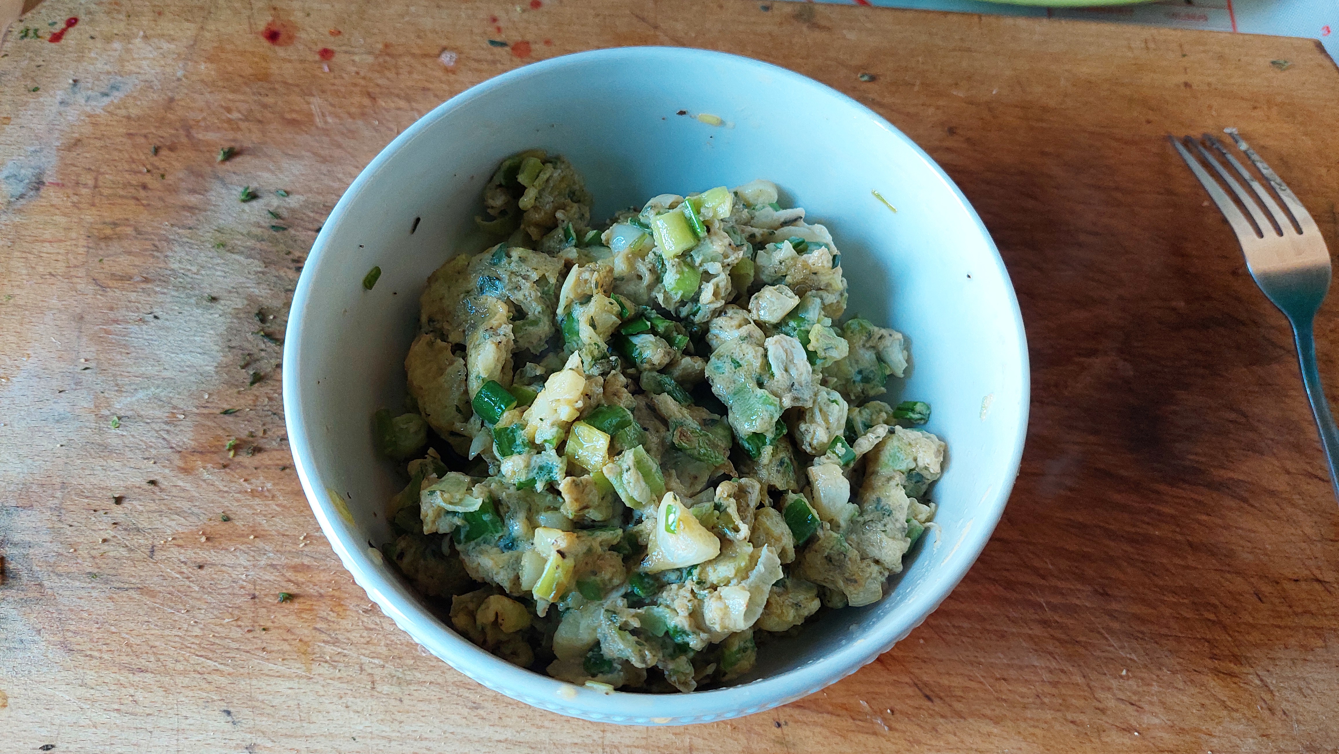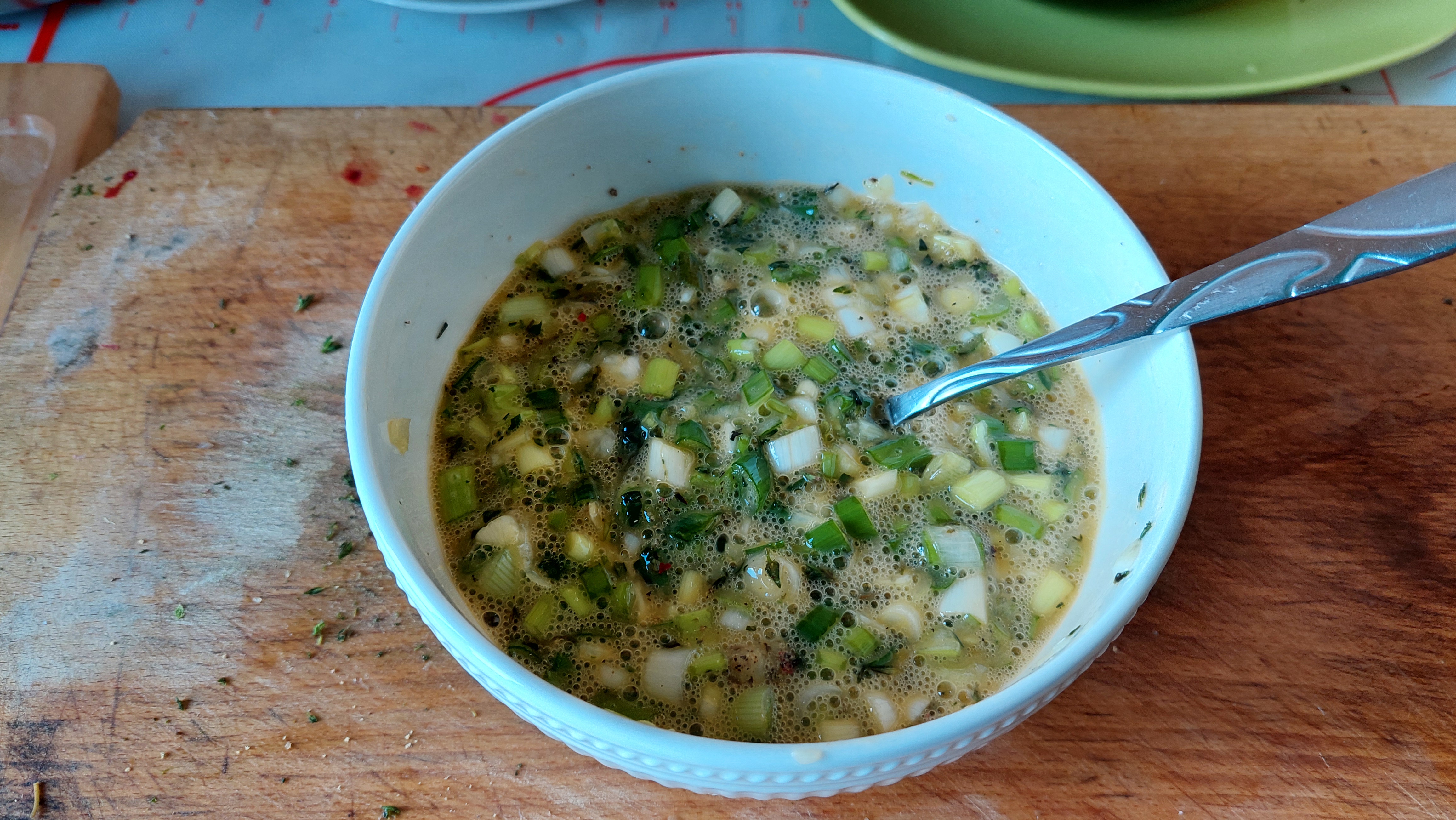 Όλα μαζί αναμειγνύονται με τρία αυγά και με μερικές σκελίδες φρέσκου, ανοιξιάτικου σκόρδου (ολόκληρο κεφάλι!).