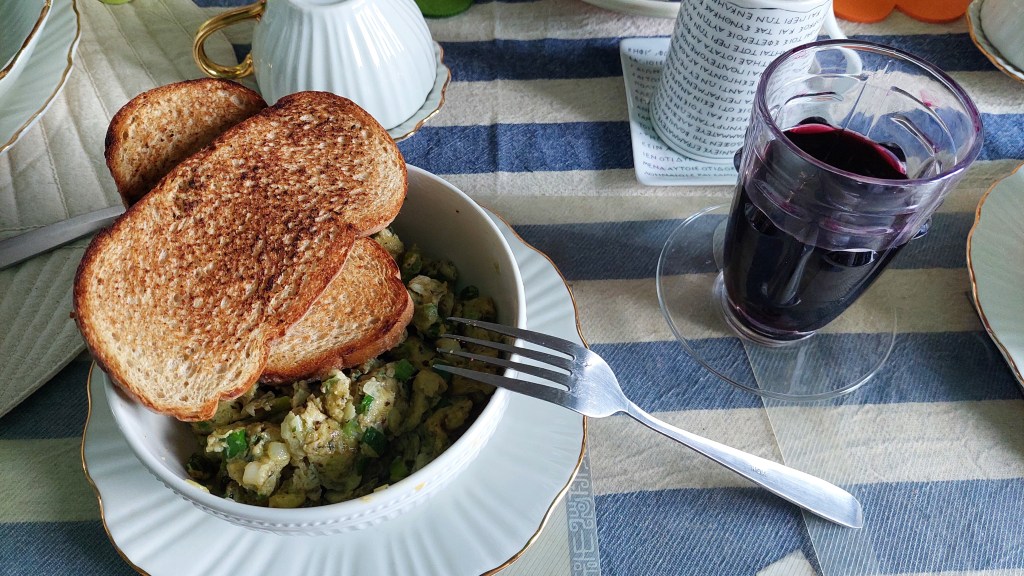 În uleiul rămas în tigaie se perpelesc două felii de pâine neagră, din făină curată, fără adaosuri. Sau, din pâinea casei…