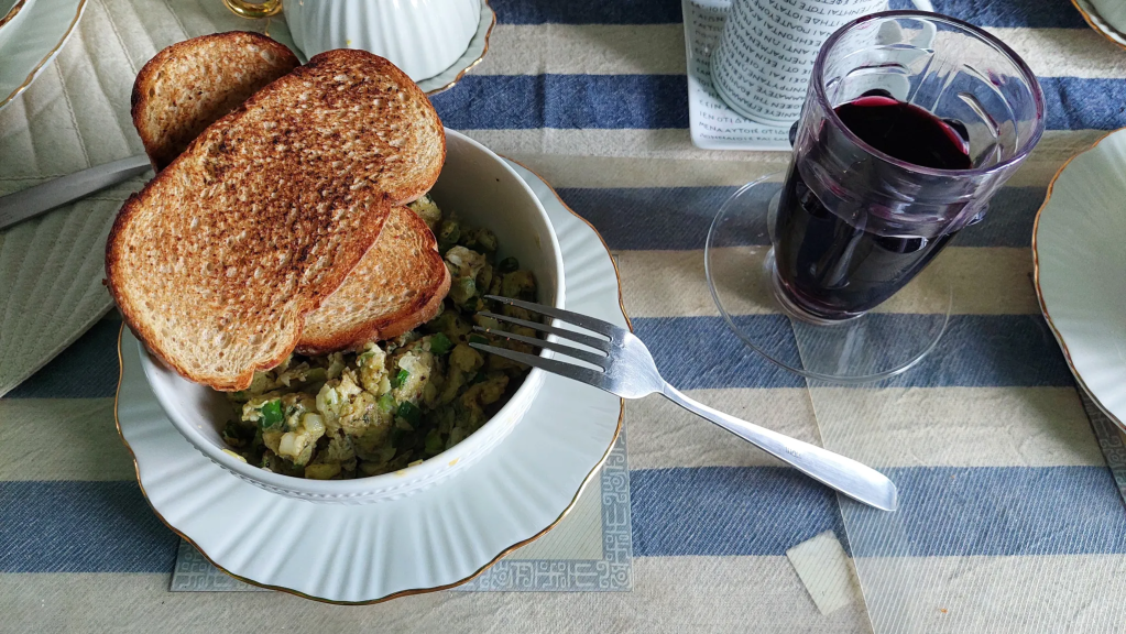 Στο λάδι που μένει στο τηγάνι καβουρδίζονται δύο φέτες μαύρο ψωμί, από καθαρό αλεύρι, χωρίς πρόσθετα. Ή από το ψωμί του σπιτιού…
