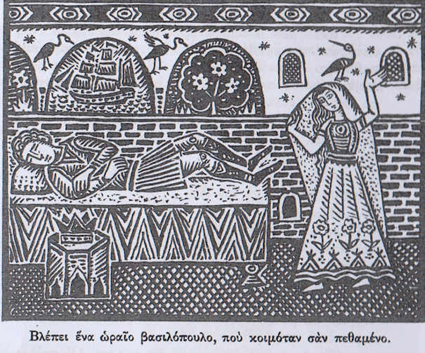 Μια φορά κι έναν καιρό ήτανε μια αρχοντοπούλα κι οι γονείς της την αγάπαγαν πολύ. Δεν την άφηναν ποτέ μοναχή. Τη φύλαγαν σαν τα μάτια τους. Κάθε πρωί σηκωνότανε κι αφού την υπηρετούσανε πρώτα οι υπηρέτριες, καθότανε στο μπαλκόνι με το κέντημά της και κένταγε. Αυτό γινόταν για πολλά χρόνια, ώσπου η κοπέλα άρχισε και μεγάλωνε. Μια μέρα από τις πολλές, εκεί που κένταγε, πέρασε ένας αετός, χαμήλωσε και της λέει: «Τι κεντάς και ξομπλιάζεις που άντρα πεθαμένο θα πάρεις;» Η κοπέλα βέβαια κατατρόμαξε ακούγοντας αυτά τα λόγια. Την άλλη μέρα, πάλι τα ίδια ο αετός. Κι η κοπέλα δεν ήξερε τίνος να το πει. Αποφάσισε τέλος να το πει στη μάνα της. «Παιδάκι μου,» της λέει η μάνα της, «άμα σ’ το ξαναπεί να του πεις: πάρε με και σύρε με εκεί που είναι ο πεθαμένος άντρας μου.» Έτσι λοιπόν και έγινε. Την άλλη μέρα, σαν πέρασε ο αετός και της είπε πάλι τα ίδια, του απάντησε η κοπέλα ό,τι της είχε πει η μάνα της. Χαμηλώνει λοιπόν ο αετός, ανοίγει τα μεγάλα φτερά του, και κάθεται η κοπέλα πάνω του. Κι εκεί που πάνε, πάνε μακριά, φτάνουν κάποτε σε μια ερημιά που βαθιά στο δάσος φαινόταν ένα σπίτι. Την κατέβασε ο αετός και την άφησε. Η κακομοίρα η κοπέλα βέβαια σκιαζόταν, αλλά, «έτσι μου έχει η μοίρα μου,» σκέφτηκε και προχώρησε για το άγνωστο σπίτι. Αφού περπάταγε όλη την ημέρα, το βράδυ φτάνει και μπαίνει στο σπίτι. Άμα μπήκε όμως τα ’χασε. Στην πρώτη πόρτα ήτανε κρεμασμένα σαράντα κλειδιά. Τα παίρνει κι άρχισε να ανοίγει μια – μια κάμαρη και τι να δουν τα μάτια της: πράματα και θάματα, φαγητά, αρχοντιές, όλα εντάξει. Χαλιά πανάκριβα στρωμένα σ’ όλες τις κάμαρες, λούσα, μεγαλεία… όλα πολύ όμορφα. Ανοίγει όμως και την τελευταία κάμαρη και τι να δει η μαύρη! Έναν ωραίο άντρα πεθαμένο, ξαπλωμένο με δεμένα χέρια και να κρατάει ένα χαρτί. «Α!» παίρνει και το διαβάζει: «Όποιος με φυλάξει σαράντα μέρες, σαράντα ώρες, σαράντα λεπτά, αν είναι γριά θα την κάνω μάνα μου, αν είναι άντρας θα τον κάνω αδερφό μου, κι αν είναι κοπέλα, γυναίκα μου. Να μην κοιμηθεί ούτε στιγμή όμως.» Έτσι κι έκανε λοιπόν η κοπέλα. Τον φύλαξε σαράντα μέρες, σαράντα ώρες και σαράντα λεπτά. Μια ώρα όμως πριν τελειώσει το στοίχημα, ακούει κάτι γύφτισσες από κάτω να φωνάζουν: «Σκλάβες, καλές σκλάβες πουλάμε!» «Δεν παίρνω μία;» συλλογίστηκε. Ρίχνει μια τριχιά, την ανεβάζει, την πληρώνει και φεύγουν οι άλλες. Έτσι όπως ήταν νυσταγμένη η κακομοίρα, «σκλαβοπούλα μου,» της λέει, «να πέσω λίγο στα γόνατά σου κι εσύ να με ψειρίσεις, ν’ αποκοιμηθώ λιγάκι, που ’χω τόσον καιρό να κοιμηθώ.» Δεν πρόλαβε να γείρει κι αποκοιμήθηκε στο λεπτό. Ξυπνάει τότε το βασιλόπουλο, γιατί ήταν η ώρα του: «Εσύ είσαι κυρά μου που με φύλαξες τόσον καιρό;» «Ναι,» του απαντάει εκείνη. «Κι αυτή η όμορφη κοπέλα που κοιμάται, ποια είναι;» «Αυτήν την έχω να φυλάει τις χήνες.» Κι η κακούργα η γύφτισσα διατάζει να κατεβάσουν την κοπέλα στις χήνες κι αυτή γίνεται βασίλισσα. Έτσι πέρναγε ο καιρός, η γύφτισσα χαιρόταν κι η καημένη η κοπέλα έκλαιγε και τα δέντρα μάραινε. Κάποτε κηρύχτηκε λοιπόν ένας πόλεμος κι έπρεπε να πάει κι ο βασιλιάς. Προτού φύγει, ρωτάει όλους στο παλάτι τι θέλουν να τους φέρει δώρο άμα θα γύριζε νικητής. Πάει και στην κοπέλα: «Εσύ, κυρά μου, τι θέλεις να σου φέρω;» «Εγώ, αφέντη βασιλιά μου, θέλω να μου φέρεις ένα μαχαίρι της σφαγής, ένα σχοινί του πνιγμού κι ένα ακόνι της υπομονής κι άμα τα λησμονήσεις, να μην ξεκινάει το καράβι που θα μπεις να έρθεις.» Πήγε λοι