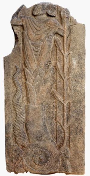 Vedem o imagine plină de simboluri falice: trunchiul înfrunzit, din care se ivește un zeu al vegetației și fertilității (poate fi Iuppiter Dolichenus), un șarpe inelat și un copăcel, înfrunzit și el, care, amândouă, se ivesc din aceeași rădăcină cu trunchiul.