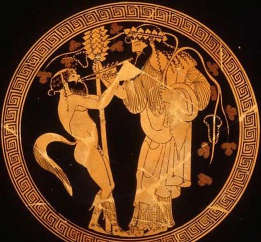 Kylix attic, aprox. 490 – 480 î. Hr.: Dionysos purtând o cunună de iederă și ținând într-o mână o mlădiță de viță de vie cu ciorchini și în cealaltă tirsul. Antikenmuseen, Berlin, Germania