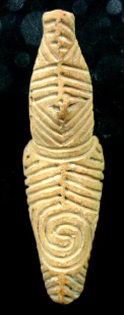 Figurină ce poate reprezenta un corp pregătit pentru așezarea în mormânt și însemnat cu semnul nașterii-renașterii, spirala de la picioare; Cucuteni, 4300-4200 î. Hr., Muzeul din Botoşani