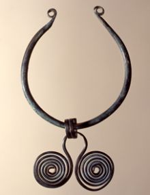 Imagen Torques de bronz (sec.  III – II î. Hr.) aflat la gâtul scheletului unui tânăr jertfit, găsit în 1895, întâmplător, într-o prăpastie, lângă castrul din Povir, Slovenia.