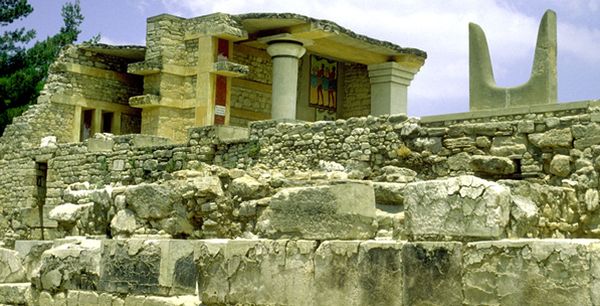 Perechea de coarne din fața palatului din Cnosos