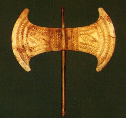 Firesc, ar spune cineva, securea bipenă este un motiv obișnuit în Palatul lui Minos. Apare în multe locuri și sub mai multe forme: pe stâlpii porților, pe ziduri sau pe coloane. De aceea și Sir A. Evans l-a numit „Casa Dublei Securi” și a primit cu entuziasm explicația colegului său german.