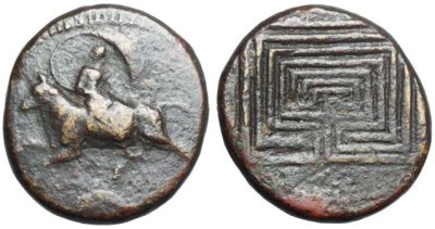 Monedă cu labirint pătrat, Cnosos, Creta, aprox. 220 î. Hr.; pe avers Europa traversând marea pe spinarea taurului/Zeus