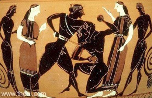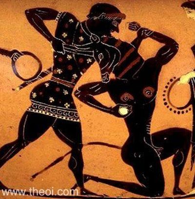 Tezeu omorând Minotaurul, amforă cu figuri negre, 550 – 530, î. Hr.,Museum of Art, Rhode Island School of Design, New York City, USA