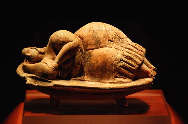 „Marea Mamă dormind” într-una din sălile Hypogeum-ului de la Hal Saflieni;Muzeul Național Arheologic din La Valletta, Malta