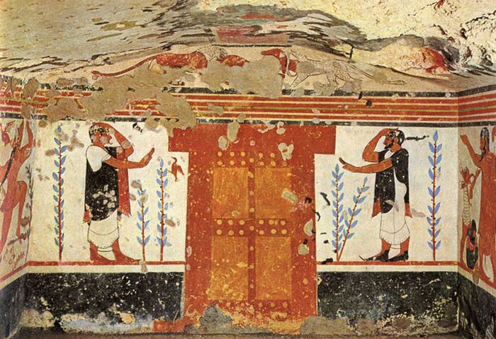 Doi auguri străjuind poarta către lumea de dincolo, Tomba degli Auguri, necropoli dei Monterozzi (Etruria antică), Italia