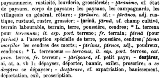 Marele nostru lingvist Alexandru Cihac, spre deosebire de MDA, e de părere că țăran vinde din *terranus, format din terrenus, în latina târzie.