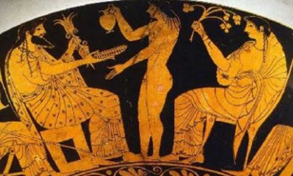 Zeus, cu svastici pe tunică, ținând fulgerul în mâna stângă și cupa în dreapta, Ganymede, paharnicul zeilor și Hestia petrecând în Olimp alături de Afrodita, Atena, Hermes și Hebe, zeița adolescenței (care nu apar în fotografie). Vas attic (kylix) cu figuri roșii, din perioada arhaică; Museo Nazionale Tarquiniese, Tarquinia, Italia