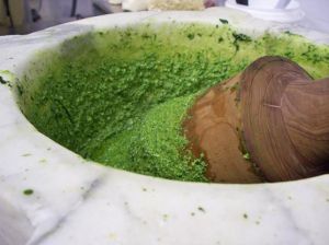 | Pe scurt despre Pesto alla genovese:Pesto este deja din 2002 un produs cu denumire de origine protejată (DOP), după ce Cavalerii Frăţiei Pesto-ului (Cavalieri della Confraternita del Pesto) au proclamat regiunea Genova „Repubblica del Pesto”.La pregătirea lui se folosesc numai:- busuiocul genovez proaspăt, Basilico Genovese, care din anul 2005 este produs cu DOP. – seminţele de pin din zona genoveză sau mediteraneană – cele două feluri tradiţionale de brânză italiene, parmezanul şi brânza de oaie (create de călugări în Evul Mediu), Parmigiano Reggiano şi Pecorino (care poate fi: pecorino sardo, pecorino romano, pecorino toscano sau pecorino siciliano), toate cu denumire de origine protejată, şi – uleiul de măsline extravirgin din producţia locală. Basilico Genovese se spune că este un busuioc special: dulce, cu frunze mici şi fragede şi foarte aromat. Se cultivă numai în cartierul Pra’ din Genova, în sere. Pra’ fiind o prescurtare pentru Prata Veituriorum, în traducere „Câmpiile Viturilor”, vechi locuitori ai Liguriei). Din 2007 la Genova se organizează în fiecare an campionatul mondial de Pesto. |
