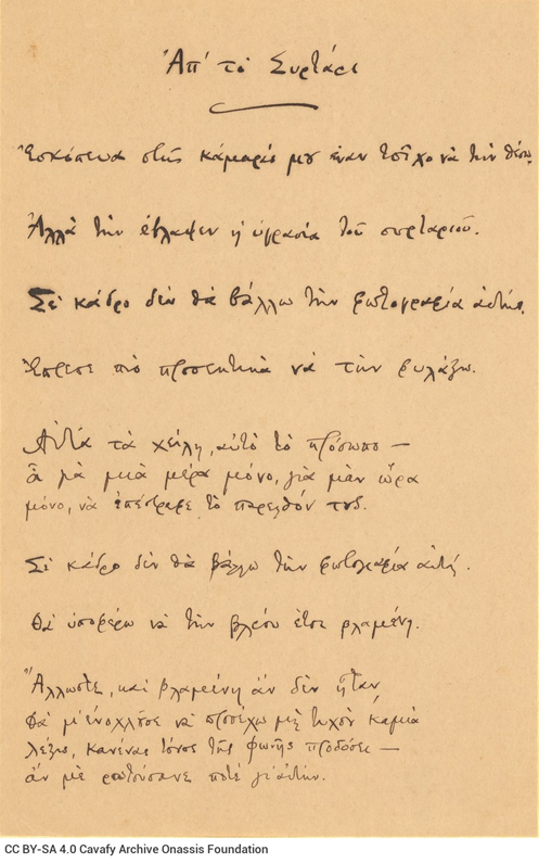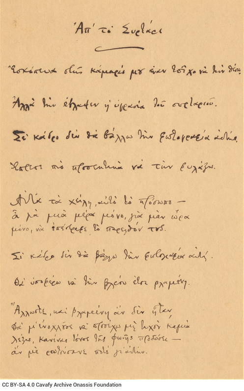 Μετά σοῦ τὸ πᾶν, νομίζω, προσηνὲς μὲ μειδιᾶ, στὸν καθρέπτη τῶν ΄ματιῶν σου τὴν χαρὰν ἀντανακλᾶ. Στάσου φῶς μου καὶ ἀκόμη δεν σὲ εἶπα τὰ μισὰ ἀπ΄ἐκεῖνα ποὺ πιέζουν τὴν ἐρῶσαν μου καρδιὰ καὶ στὰ χείλη μου ὁρμοῦνε μὲ μιὰ μόνη σου ΄ματιὰ. Μὴ μὲ ὁμιλεῖς ἂν θέλης, μὴ μὲ πεῖς γοητευτικὰ λόγια ἀγάπης καὶ λατρείας. Φθάνει νἆσαι ἐδῶ κοντά, νὰ σὲ λέγω πὼς σὲ θέλω, νὰ σʼἐγγίζω, τὴν δροσιὰ τοῦ πρωϊοῦ ποὺ ἀναπνέεις νʼ ἀναπνέω, κι ἂν καὶ αὐτὰ ὑπερβολικὰ τὰ βρίσκῃς νὰ σὲ βλέπω μοναχά! [1886]