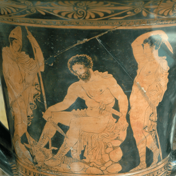 Odiseu/Ulise în Lumea de Jos/Hades, vorbind cu umbra lui Tiresias; cupă cu figuri roșii din Lucania, Italia, aprox. 380 î. Hr.