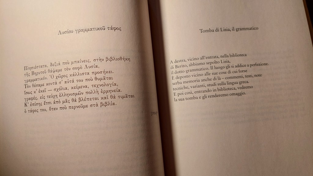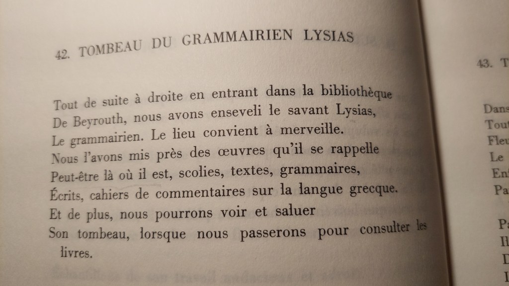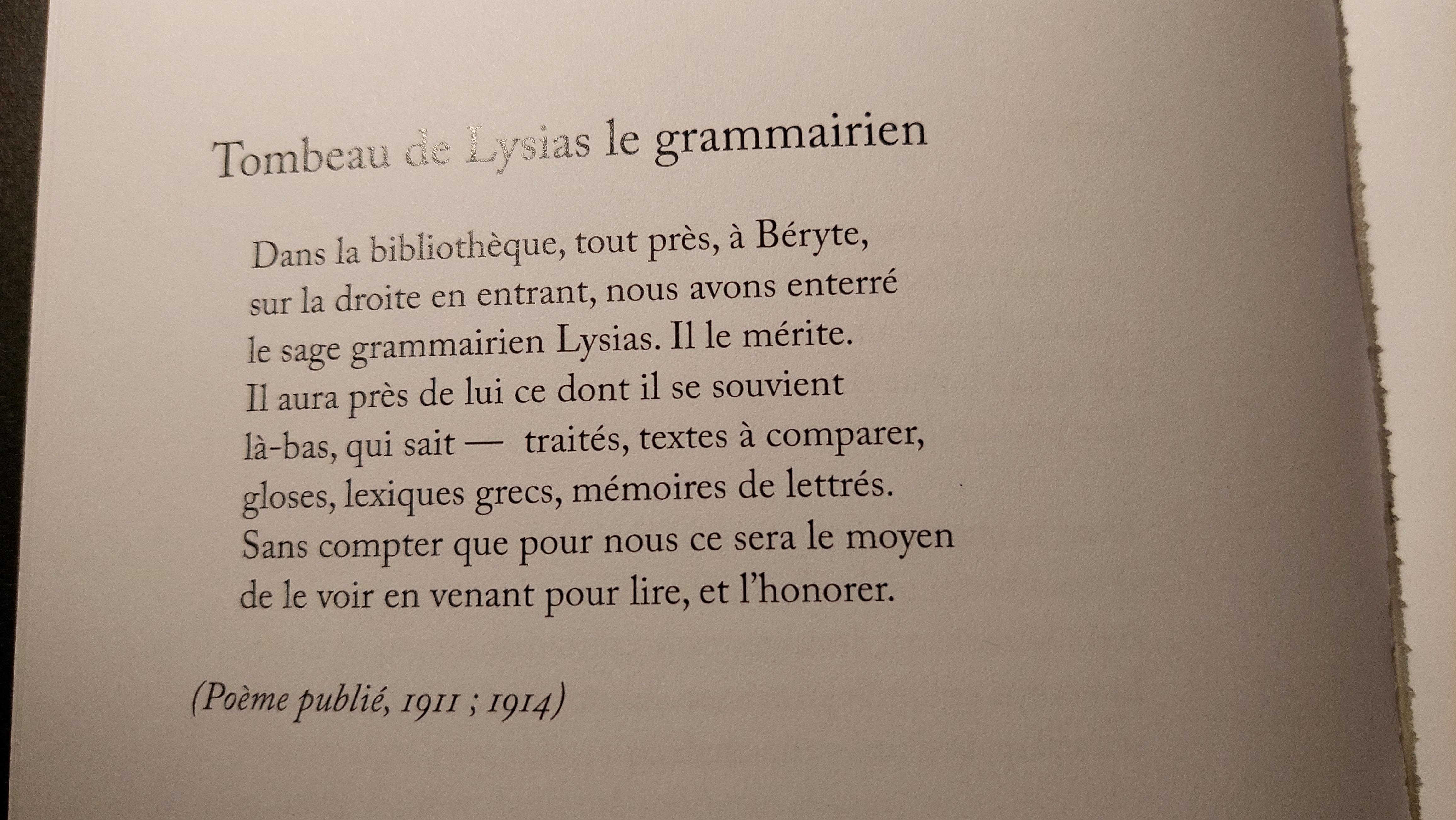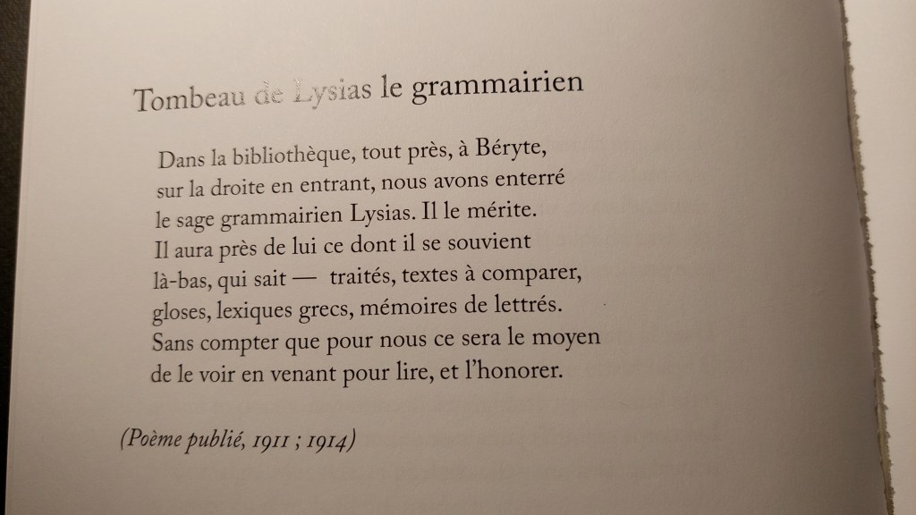 Ce să fi citit Kavafis? Ce să-l fi inspirat? Epitafurile/Epigramele din Antologia Palatină? Antologia Palatină… Biblia lui. Ce l-a făcut să-l creeze pe dascălul din Beirut? Lysias, un nume foarte… grecesc, poate a existat… poate a fost chiar șeful școlii de gramatică din acest oraș cu o bogată tradiție de filologie clasică. Unul din cele mai importante pentru Diasporă, bine elenizat. Lysias: filolog, sholiast, editor al clasicilor greci, autor de gramatici, de dicționare/lexicoane, așadar lexicograf… Un hermeneut care edita, adnota și comenta scrierile lui Homer, ale tragicilor, ale lui Aristofan, Platon și Aristotel, care (re)stabilea, așadar, textul original, curățându-l de adaosuri și interpolări ale diverșilor copiști; un gramatic care întocmea liste paralele de cuvinte, forme și expresii din greaca clasică care, în limba comună, koine (κοινή), greaca alexandrină (aici feniciană), de fapt, greaca vorbită în Diaspora, ajunseseră să fie deformate de vorbitorii barbari/ne-greci.