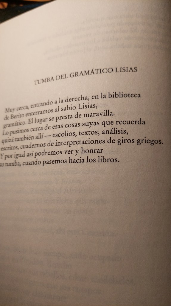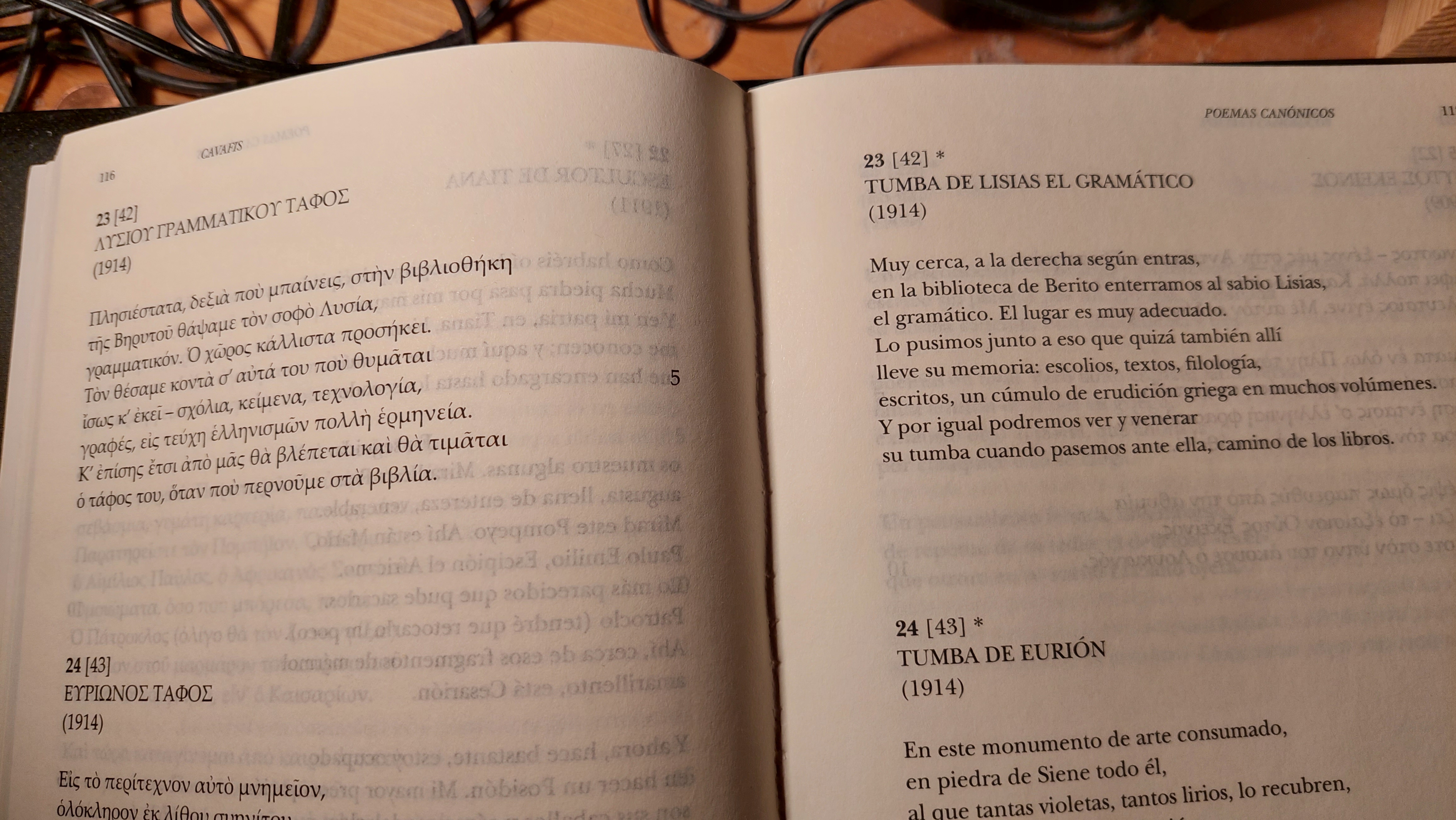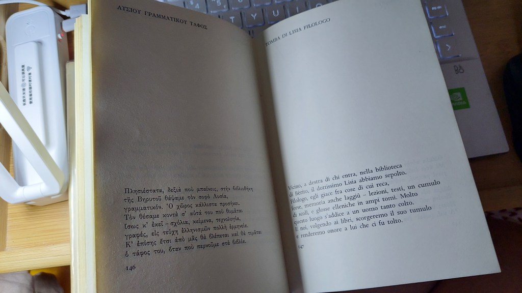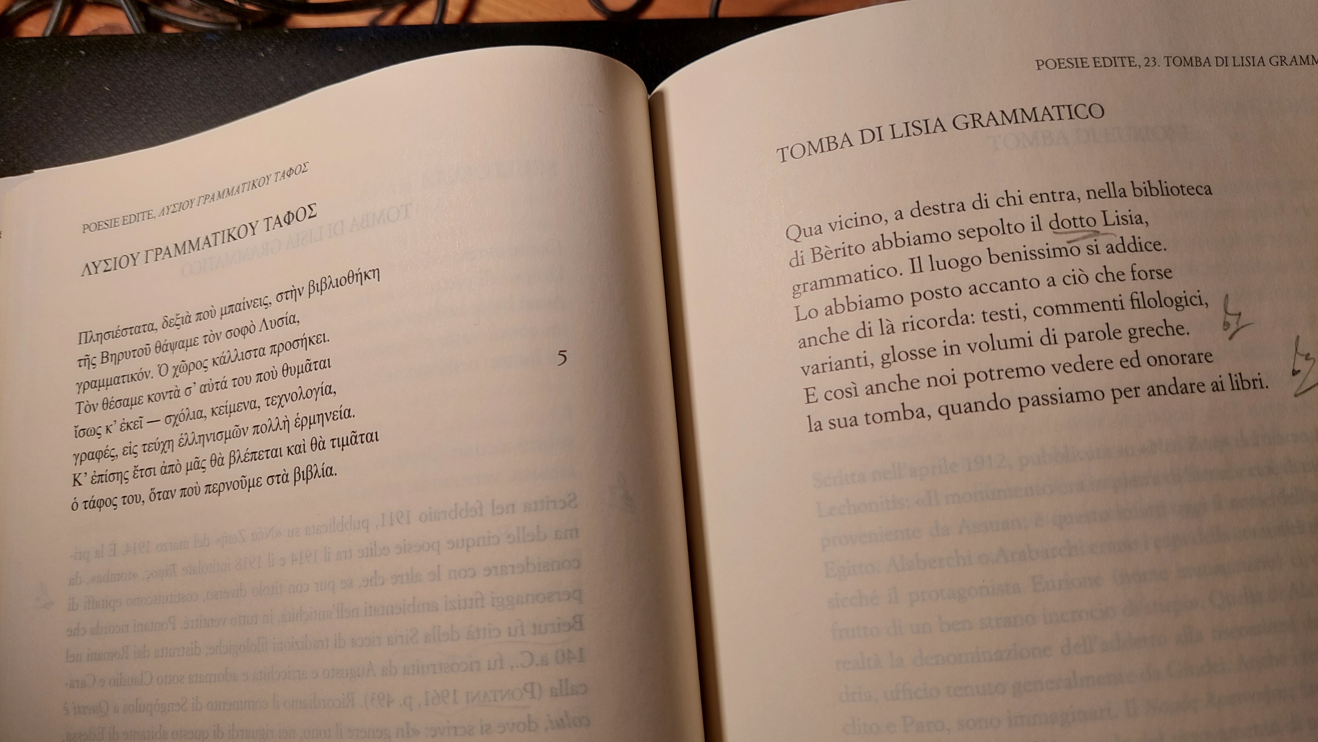 Ce să fi citit Kavafis? Ce să-l fi inspirat? Epitafurile/Epigramele din Antologia Palatină? Antologia Palatină… Biblia lui. Ce l-a făcut să-l creeze pe dascălul din Beirut? Lysias, un nume foarte… grecesc, poate a existat… poate a fost chiar șeful școlii de gramatică din acest oraș cu o bogată tradiție de filologie clasică. Unul din cele mai importante pentru Diasporă, bine elenizat. Lysias: filolog, sholiast, editor al clasicilor greci, autor de gramatici, de dicționare/lexicoane, așadar lexicograf… Un hermeneut care edita, adnota și comenta scrierile lui Homer, ale tragicilor, ale lui Aristofan, Platon și Aristotel, care (re)stabilea, așadar, textul original, curățându-l de adaosuri și interpolări ale diverșilor copiști; un gramatic care întocmea liste paralele de cuvinte, forme și expresii din greaca clasică care, în limba comună, koine (κοινή), greaca alexandrină (aici feniciană), de fapt, greaca vorbită în Diaspora, ajunseseră să fie deformate de vorbitorii barbari/ne-greci.